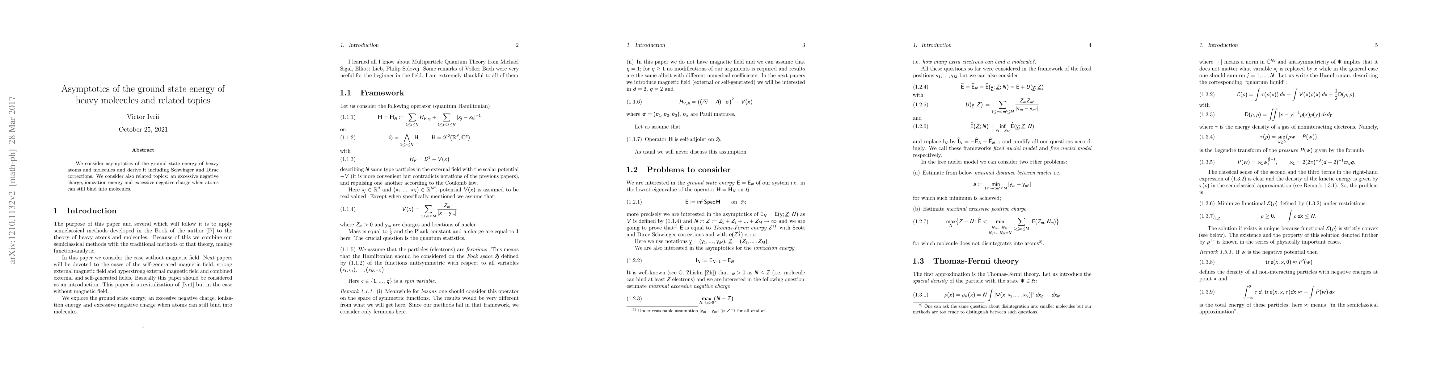 Summary: This paper derives the asymptotic behavior of the ground state energy in heavy atoms and molecules, incorporating Schwinger and Dirac corrections, and explores related phenomena such as excessive negative charge, ionization energy, and the binding of atoms into molecules despite high charges.