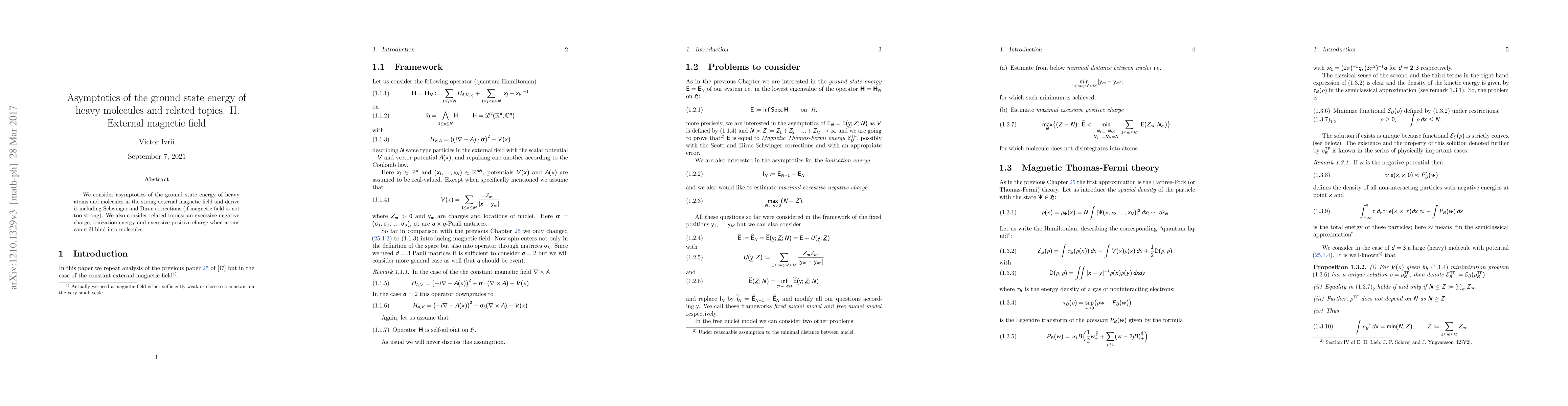 This paper explores the asymptotic behavior of the ground state energy in heavy atoms and molecules under strong external magnetic fields, incorporating Schwinger and Dirac corrections. It also examines related phenomena such as excessive negative charge, ionization energy, and excessive positive charge in the context of molecular binding.