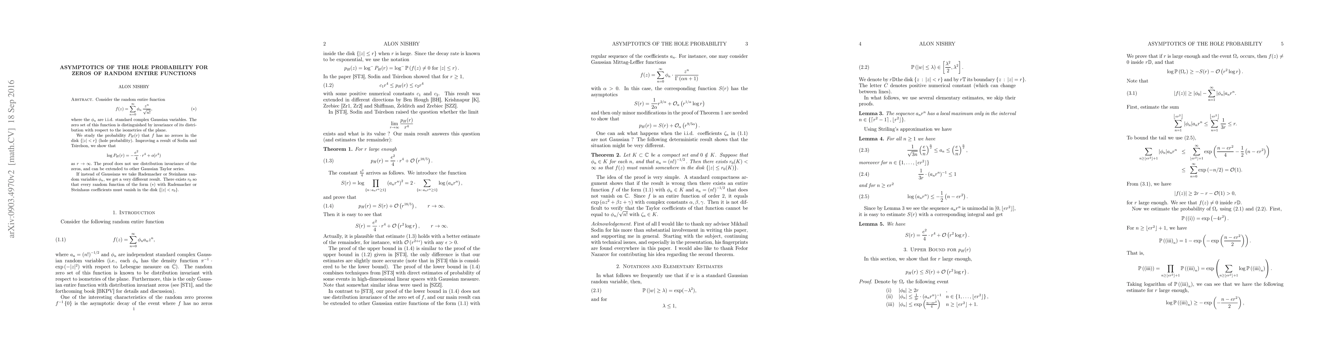 This paper investigates the hole probability for zeros of Gaussian random entire functions, specifically under the flat model. The study reveals that the logarithm of the hole probability asymptotically decays as -1/4 * e^2 * r^4 + o(r^4) for large radii r, and also explores variations with different random coefficient distributions.