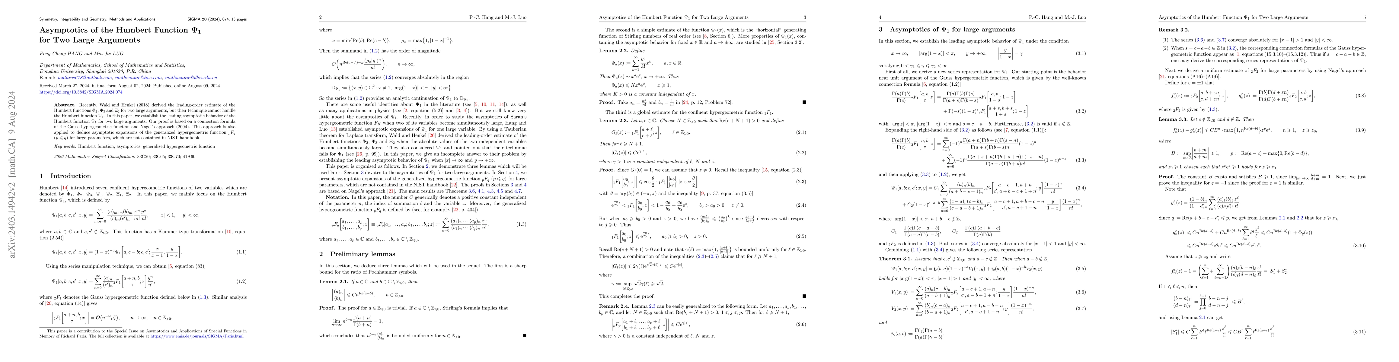 This paper establishes the leading asymptotic behavior of the Humbert function $\Psi_1$ for two large arguments, using a connection formula of the Gauss hypergeometric function and Nagel's approach. It also extends this method to derive asymptotic expansions for generalized hypergeometric functions ${}_pF_q$ for large parameters.