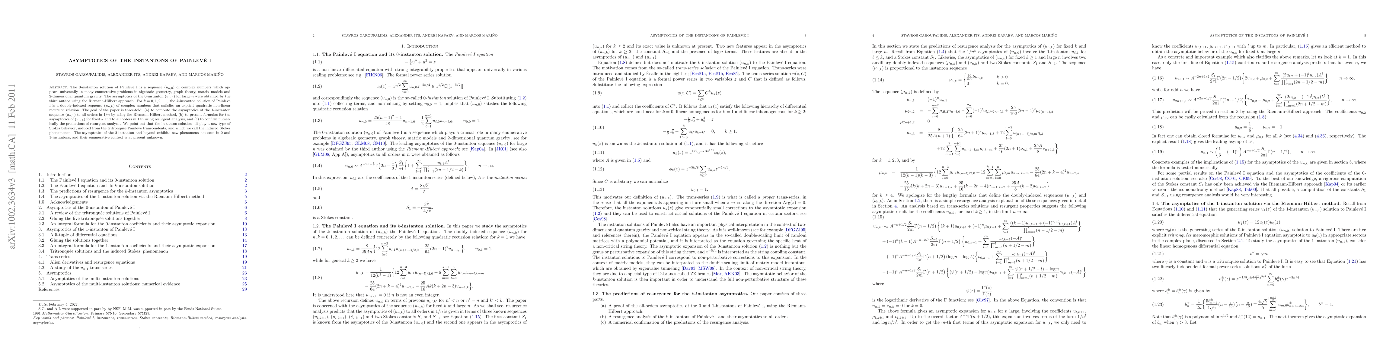 The 0-instanton solution of Painlev\'e I is a sequence $(u_{n,0})$ of complex numbers which appears universally in many enumerative problems in algebraic geometry, graph theory, matrix models and 2-dimensional quantum gravity. The asymptotics of the 0-instanton $(u_{n,0})$ for large $n$ were obtained by the third author using the Riemann-Hilbert approach. For $k=0,1,2,...$, the $k$-instanton solution of Painlev\'e I is a doubly-indexed sequence $(u_{n,k})$ of complex numbers that satisfies an explicit quadratic non-linear recursion relation. The goal of the paper is three-fold: (a) to compute the asymptotics of the 1-instanton sequence $(u_{n,1})$ to all orders in $1/n$ by using the Riemann-Hilbert method, (b) to present formulas for the asymptotics of $(u_{n,k})$ for fixed $k$ and to all orders in $1/n$ using resurgent analysis, and (c) to confirm numerically the predictions of resurgent analysis. We point out that the instanton solutions display a new type of Stokes behavior, induced from the tritronqu\'ee Painlev\'e transcendents, and which we call the induced Stokes phenomenon. The asymptotics of the 2-instanton and beyond exhibits new phenomena not seen in 0 and 1-instantons, and their enumerative context is at present unknown.