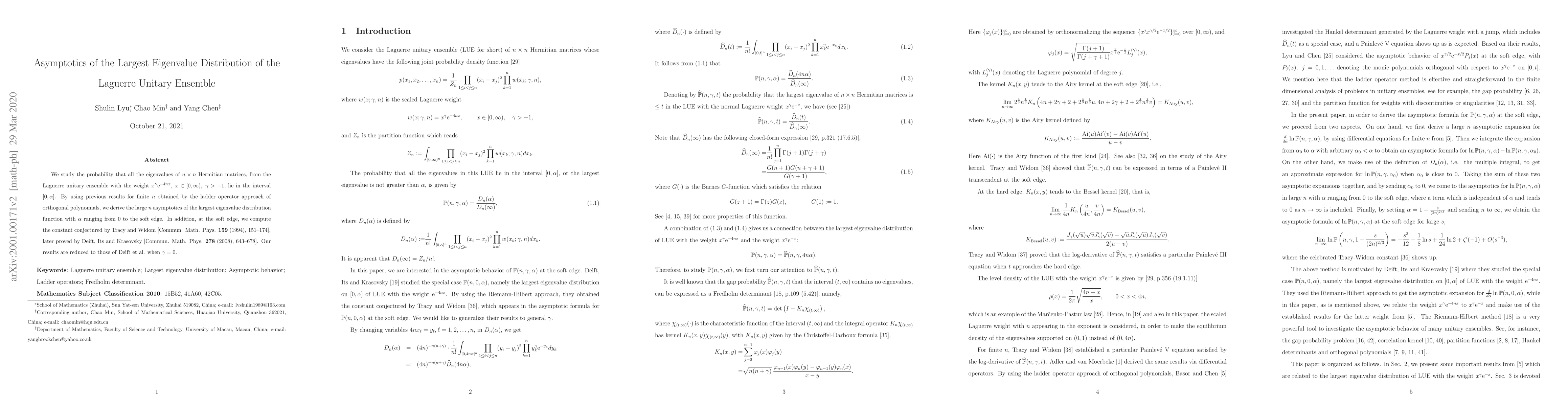 This paper investigates the asymptotic behavior of the largest eigenvalue distribution for $n \times n$ Hermitian matrices from the Laguerre unitary ensemble, deriving the large $n$ asymptotics and confirming the Tracy-Widom constant at the soft edge. The results align with previous findings when $\gamma=0$.
