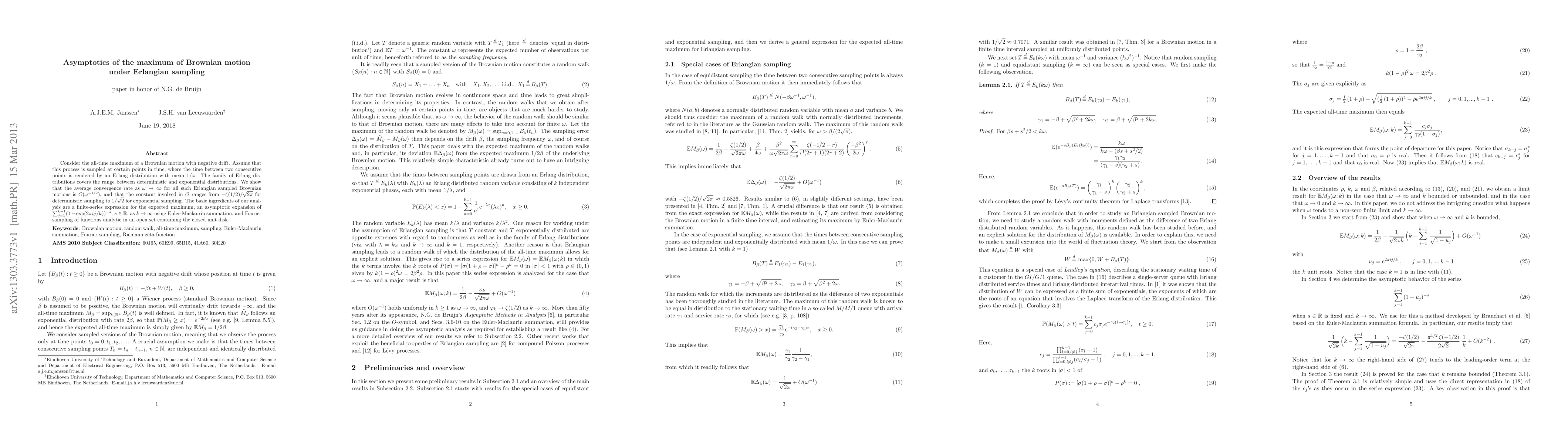 The paper analyzes the asymptotics of the maximum value of a Brownian motion with negative drift sampled at points following an Erlang distribution, finding that its convergence rate is O(ω^{-1/2}) as ω approaches infinity.