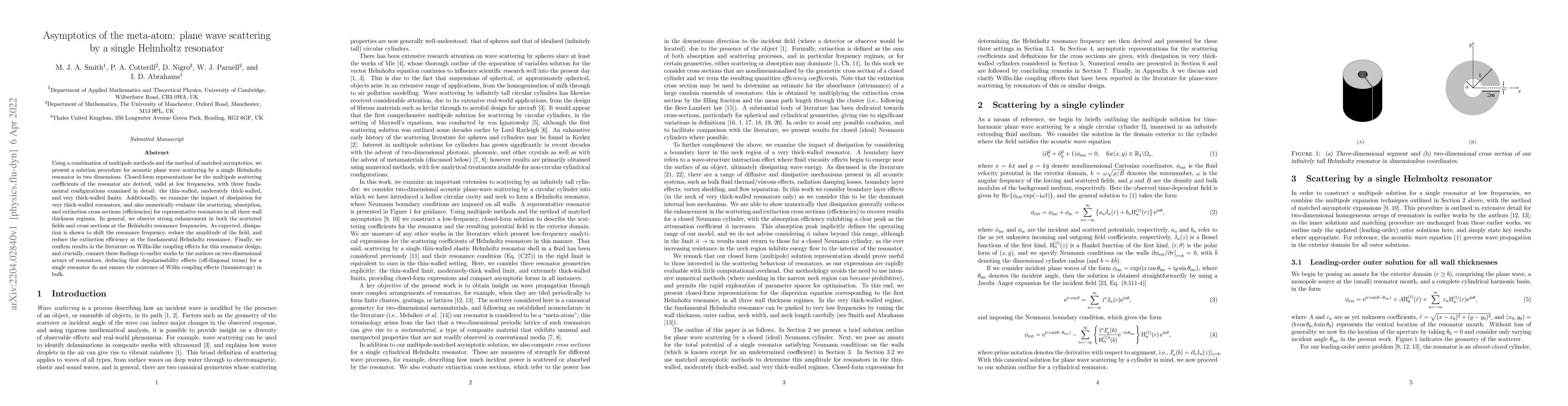 The research employs a combination of multipole methods and the method of matched asymptotic expansions to solve for acoustic plane wave scattering by a single Helmholtz resonator in two dimensions, valid at low frequencies.