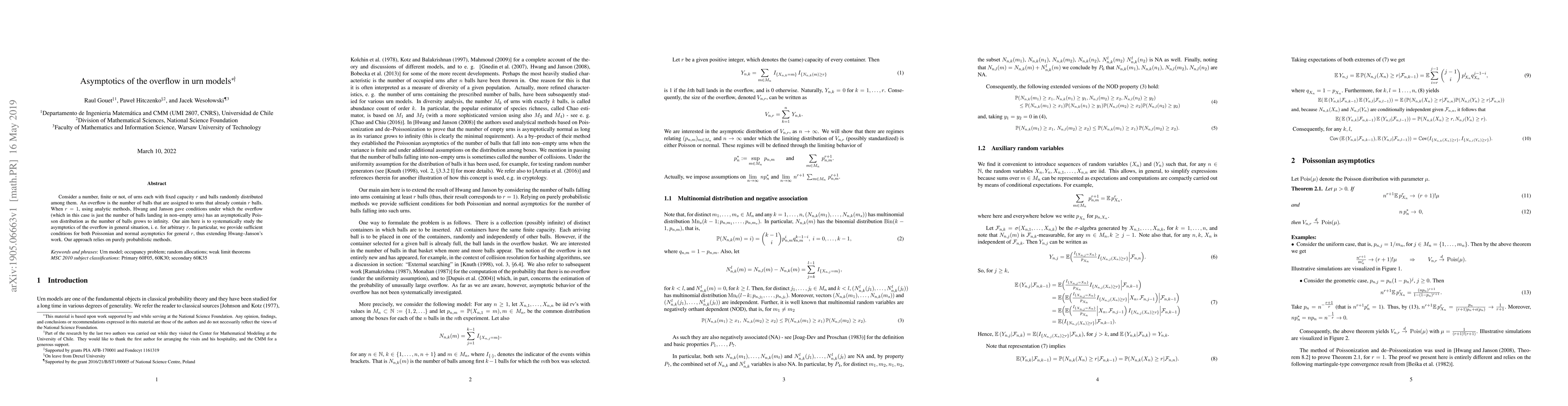 Consider a number, finite or not, of urns each with fixed capacity $r$ and balls randomly distributed among them. An overflow is the number of balls that are assigned to urns that already contain $r$ balls. When $r=1$, using analytic methods, Hwang and Janson gave conditions under which the overflow (which in this case is just the number of balls landing in non--empty urns) has an asymptotically Poisson distribution as the number of balls grows to infinity. Our aim here is to systematically study the asymptotics of the overflow in general situation, i.~e. for arbitrary $r$. In particular, we provide sufficient conditions for both Poissonian and normal asymptotics for general $r$, thus extending Hwang--Janson's work. Our approach relies on purely probabilistic methods.