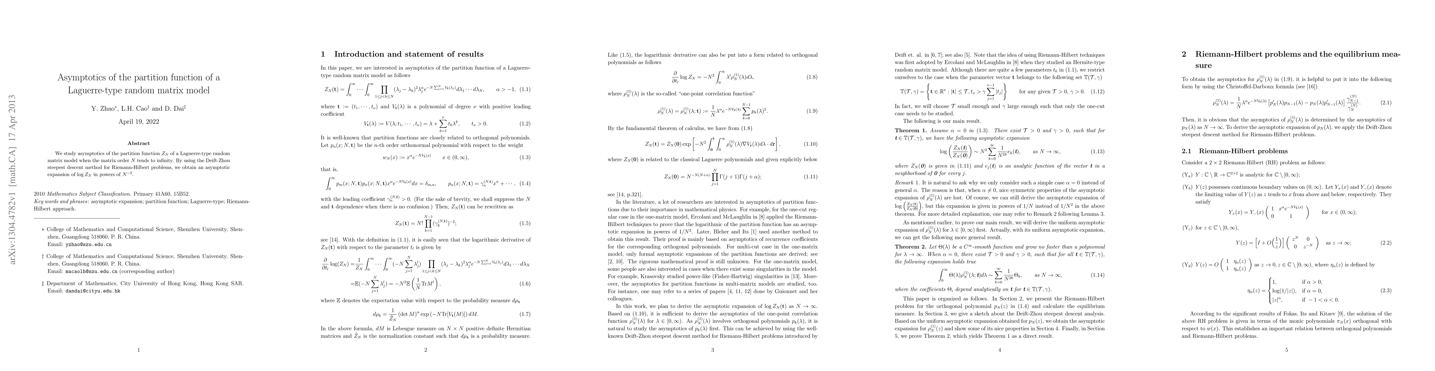We study asymptotics of the partition function $Z_N$ of a Laguerre-type random matrix model when the matrix order $N$ tends to infinity. By using the Deift-Zhou steepest descent method for Riemann-Hilbert problems, we obtain an asymptotic expansion of $\log Z_N$ in powers of $N^{-2}$.