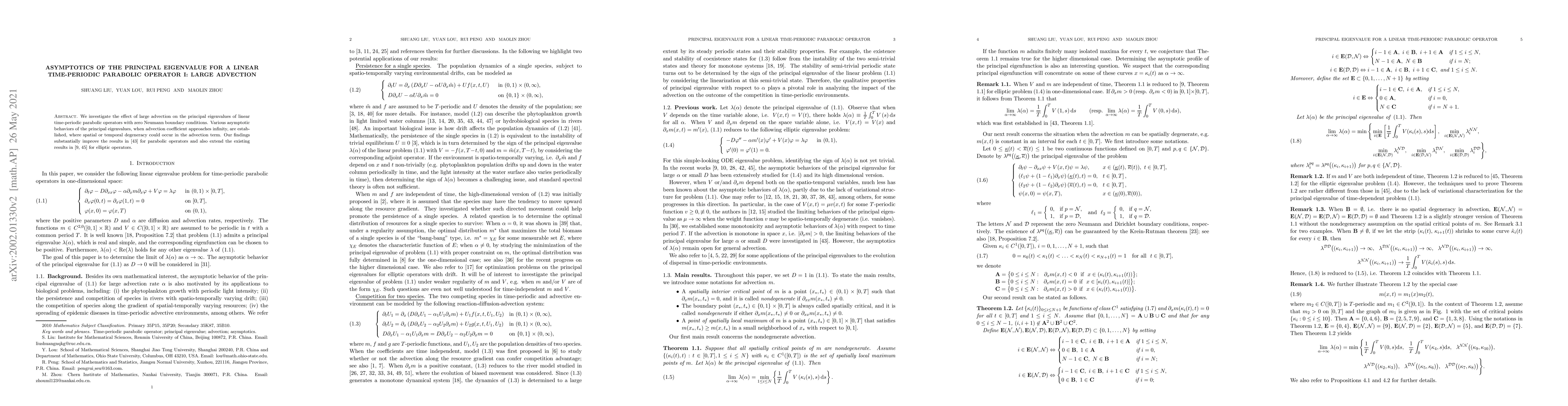 We investigate the effects of advection on the principal eigenvalues of linear time-periodic parabolic operators with zero Neumann boundary conditions. Various asymptotic behaviors of the principal eigenvalues, when advection coefficient approaches infinity, are established in heterogeneous environments, where spatial or temporal degeneracy could occur in the advection term. Our findings partially extend the existing results in Chen-Lou [2008 Indiana Univ. Math. J.] and Peng-Zhou [2018 Indiana Univ. Math. J.] for elliptic operators and those in Peng-Zhao [2015 Calc. Var. Partial Diff.] for parabolic operators.