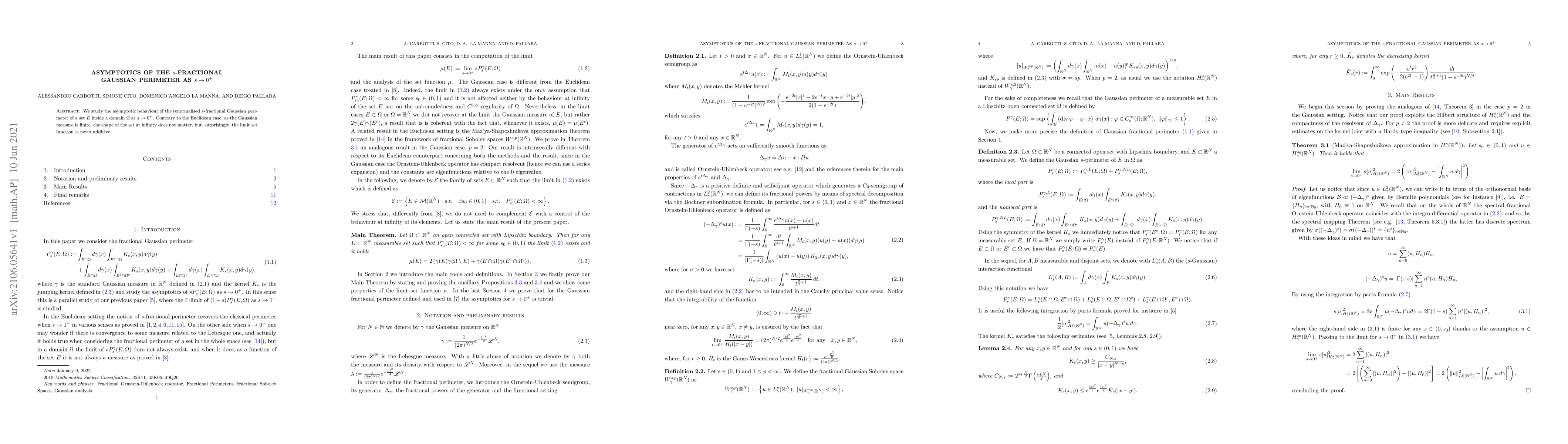 This paper investigates the asymptotic behavior of the renormalised $s$-fractional Gaussian perimeter of a set as $s$ approaches $0^+$. It reveals that unlike the Euclidean case, the Gaussian perimeter's limit is not additive, despite the Gaussian measure being finite and independent of the set's shape at infinity.