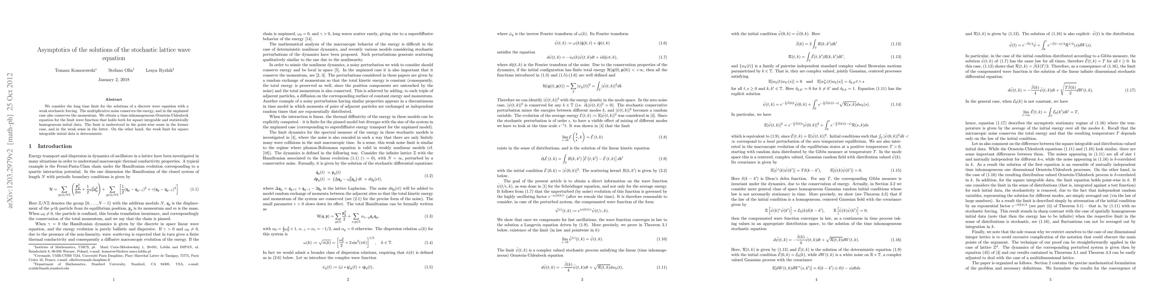 We consider the long time limit theorems for the solutions of a discrete wave equation with a weak stochastic forcing. The multiplicative noise conserves the energy and the momentum. We obtain a time-inhomogeneous Ornstein-Uhlenbeck equation for the limit wave function that holds both for square integrable and statistically homogeneous initial data. The limit is understood in the point-wise sense in the former case, and in the weak sense in the latter. On the other hand, the weak limit for square integrable initial data is deterministic.