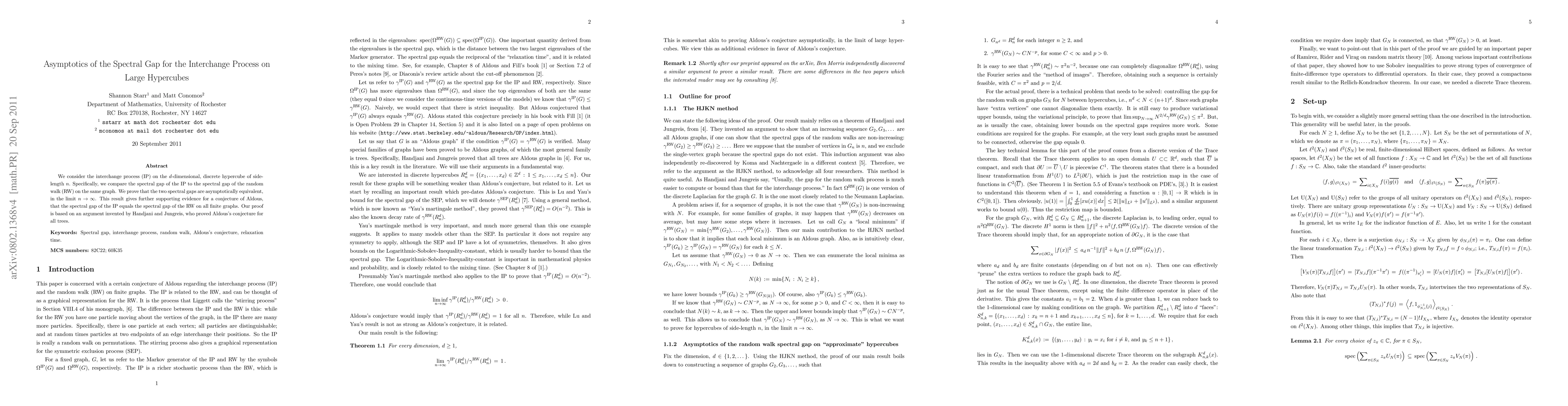 This paper investigates the asymptotic equivalence of the spectral gaps for the interchange process (IP) and the random walk (RW) on large $d$-dimensional hypercubes, supporting Aldous's conjecture. The findings, built on Handjani and Jungreis's method, also have implications for the spectral gap in quantum Heisenberg ferromagnetism.