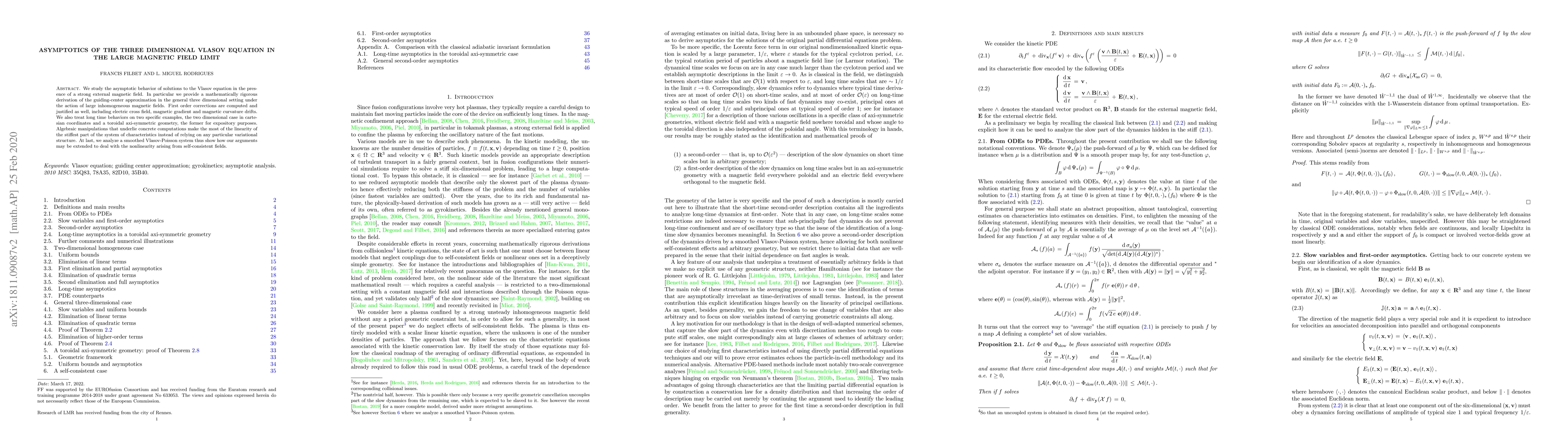 We study the asymptotic behavior of solutions to the Vlasov equation in the presence of a strong external magnetic field. In particular we provide a mathematically rigorous derivation of the guiding-center approximation in the general three dimensional setting under the action of large inhomogeneous magnetic fields. First order corrections are computed and justified as well, including electric cross field, magnetic gradient and magnetic curvature drifts. We also treat long time behaviors on two specific examples, the two dimensional case in carte-sian coordinates and a poloidal axi-symmetric geometry, the former for expository purposes. Algebraic manipulations that underlie concrete computations make the most of the linearity of the stiffest part of the system of characteristics instead of relying on any particular variational structure.