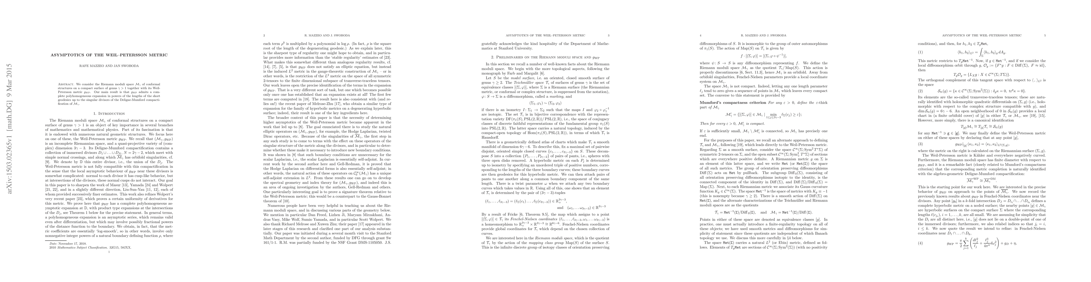The paper investigates the asymptotic behavior of the Weil-Petersson metric on Riemann moduli spaces of compact surfaces, finding a complete polyhomogeneous expansion in terms of short geodesic lengths.