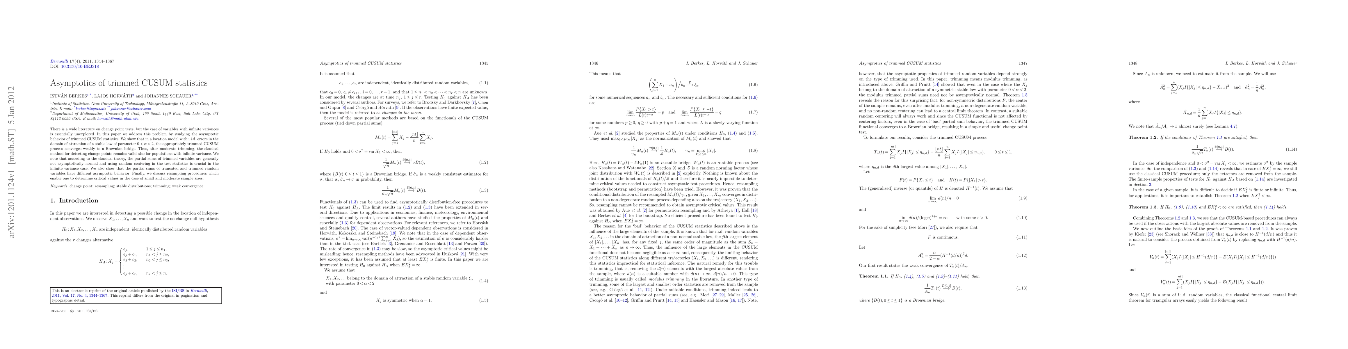 There is a wide literature on change point tests, but the case of variables with infinite variances is essentially unexplored. In this paper we address this problem by studying the asymptotic behavior of trimmed CUSUM statistics. We show that in a location model with i.i.d. errors in the domain of attraction of a stable law of parameter $0<\alpha <2$, the appropriately trimmed CUSUM process converges weakly to a Brownian bridge. Thus, after moderate trimming, the classical method for detecting change points remains valid also for populations with infinite variance. We note that according to the classical theory, the partial sums of trimmed variables are generally not asymptotically normal and using random centering in the test statistics is crucial in the infinite variance case. We also show that the partial sums of truncated and trimmed random variables have different asymptotic behavior. Finally, we discuss resampling procedures which enable one to determine critical values in the case of small and moderate sample sizes.