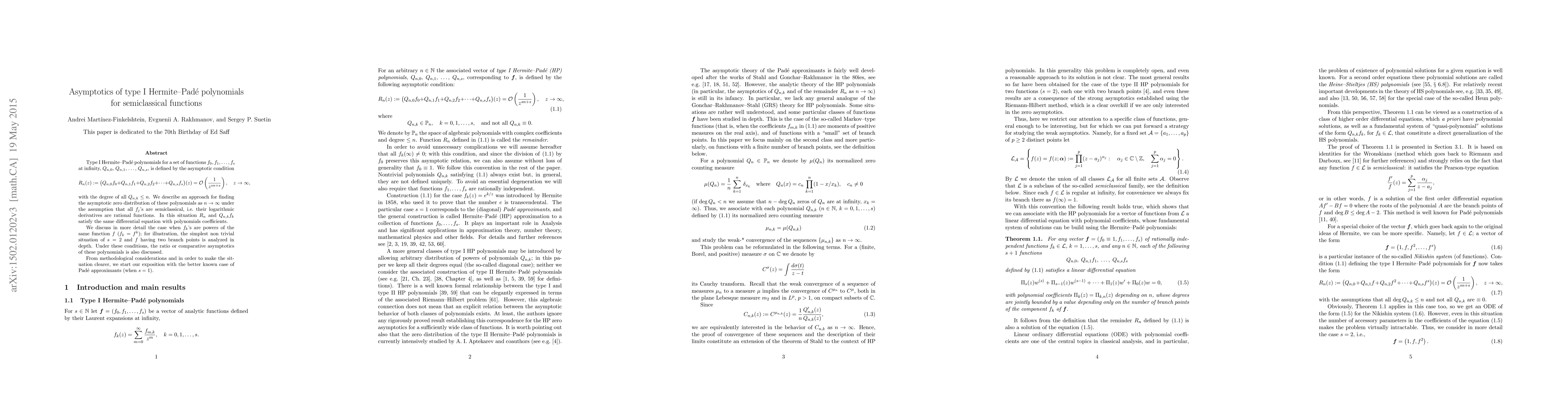 Type I Hermite--Pad\'e polynomials for a set of functions $f_0, f_1, ..., f_s$ at infinity, $Q_{n,0}$, $Q_{n,1}$, ..., $Q_{n,s}$, is defined by the asymptotic condition $$ R_n(z):=\bigl(Q_{n,0}f_0+Q_{n,1}f_1+Q_{n,2}f_2+...+Q_{n,s}f_s\bigr)(z) =\mathcal O (\frac1{z^{s n+s}}), \quad z\to\infty, $$ with the degree of all $Q_{n,k}\leq n$. We describe an approach for finding the asymptotic zero distribution of these polynomials as $n\to \infty$ under the assumption that all $f_j$'s are semiclassical, i.e. their logarithmic derivatives are rational functions. In this situation $R_n$ and $Q_{n,k}f_k$ satisfy the same differential equation with polynomials coefficients. We discuss in more detail the case when $f_k$'s are powers of the same function $f$ ($f_k=f^k$); for illustration, the simplest non trivial situation of $s=2$ and $f$ having two branch points is analyzed in depth. Under these conditions, the ratio or comparative asymptotics of these polynomials is also discussed. From methodological considerations and in order to make the situation clearer, we start our exposition with the better known case of Pad\'e approximants (when $s=1$).
