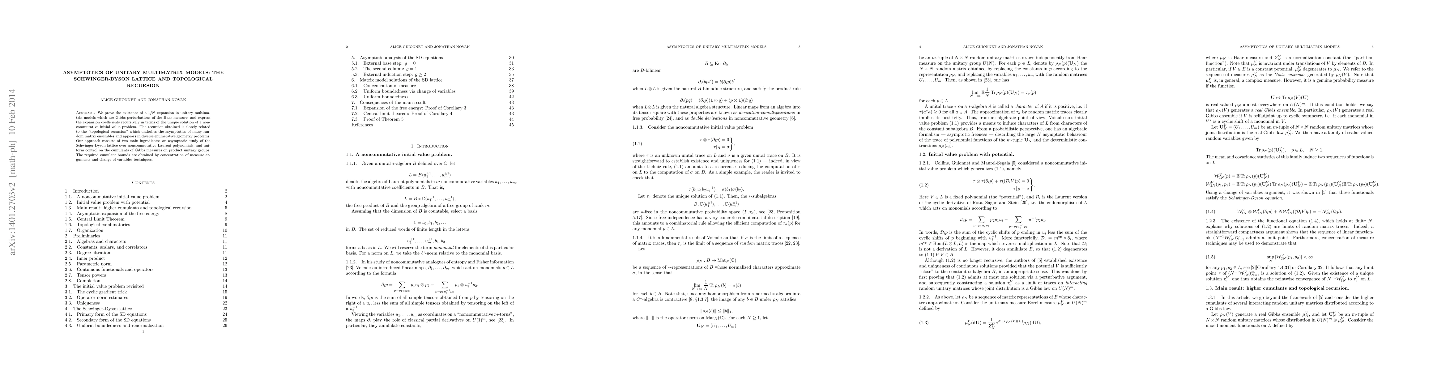 We prove the existence of a 1/N expansion in unitary multimatrix models which are Gibbs perturbations of the Haar measure, and express the expansion coefficients recursively in terms of the unique solution of a noncommutative initial value problem. The recursion obtained is closely related to the "topological recursion" which underlies the asymptotics of many random matrix ensembles and appears in diverse enumerative geometry problems, but has not previously appeared in the context of random unitary matrices. Our approach consists of two main ingredients: an asymptotic study of the Schwinger-Dyson lattice over noncommutative Laurent polynomials, and uniform control on the cumulants of Gibbs measures on product unitary groups. The required cumulant bounds are obtained by concentration of measure arguments.