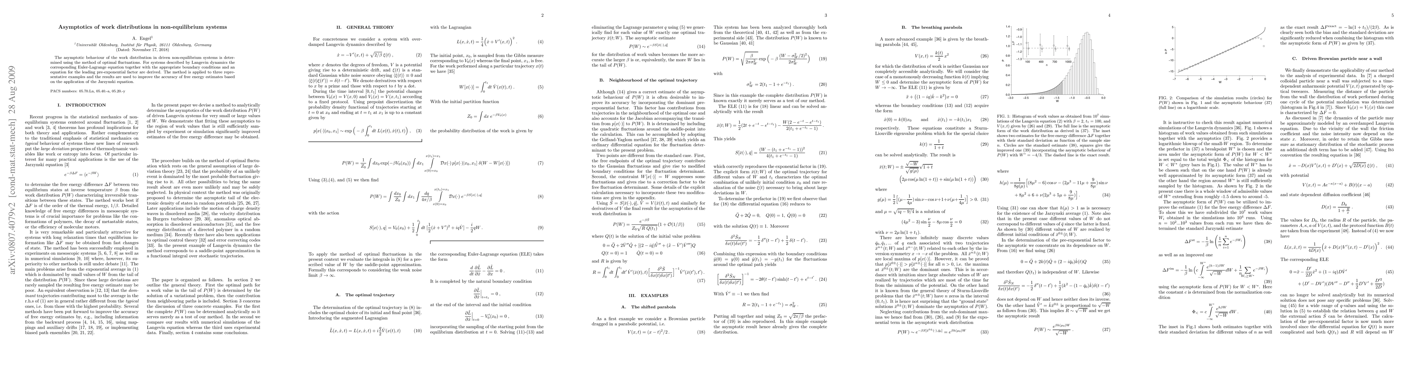 This paper investigates the asymptotic behavior of work probability distributions in driven non-equilibrium systems via optimal fluctuation methods, deriving Euler-Lagrange equations and applying them to three examples to enhance free energy estimates using the Jarzynski equation.