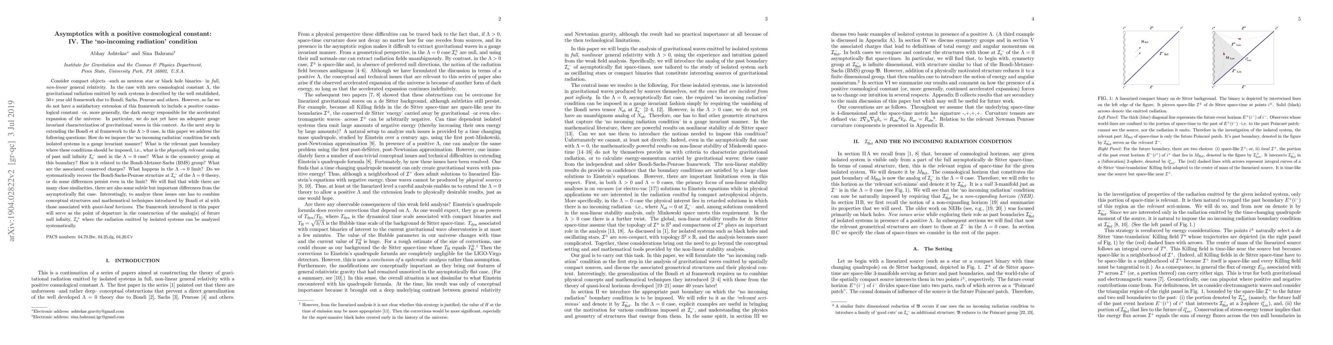 This paper extends the Bondi-Sachs framework to systems with a positive cosmological constant, focusing on the "no incoming radiation" condition in a gauge invariant manner. It identifies the relevant past boundary and symmetry group for gravitational waves in this context, revealing subtle differences compared to the asymptotically flat case, while combining techniques from both general relativity and quasi-local horizons.