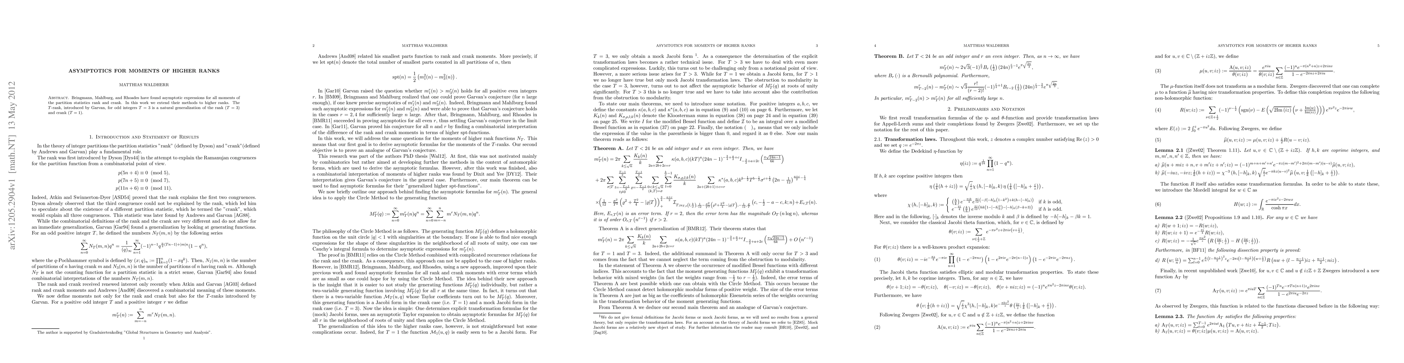 This paper extends the asymptotic expressions for moments of rank and crank partition statistics to higher ranks, specifically focusing on the $T$-rank for odd integers, generalizing the traditional rank and crank. The methodology builds on prior work by Bringmann, Mahlburg, and Rhoades.