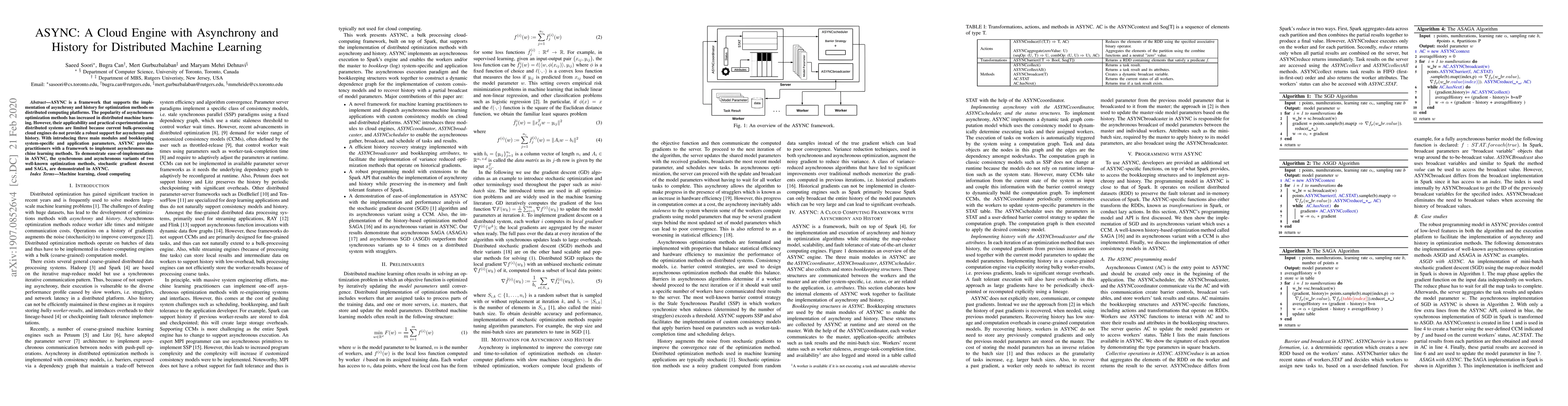 ASYNC is a framework designed to support asynchronous optimization methods for distributed machine learning, addressing the limitations of current bulk-processing cloud engines. It demonstrates the implementation of asynchronous variants of stochastic gradient descent and SAGA, showcasing its practical applicability.