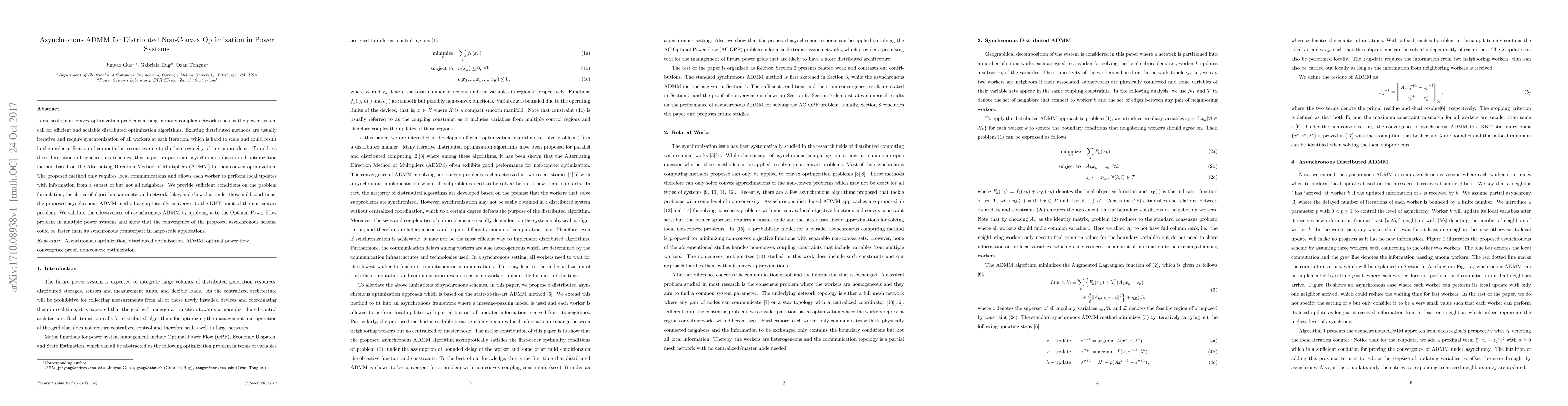 This paper proposes an asynchronous distributed optimization method based on ADMM for solving large-scale, non-convex optimization problems in power systems, allowing local updates without full synchronization. It demonstrates asymptotic convergence under mild conditions and shows faster convergence compared to synchronous methods in large-scale applications.