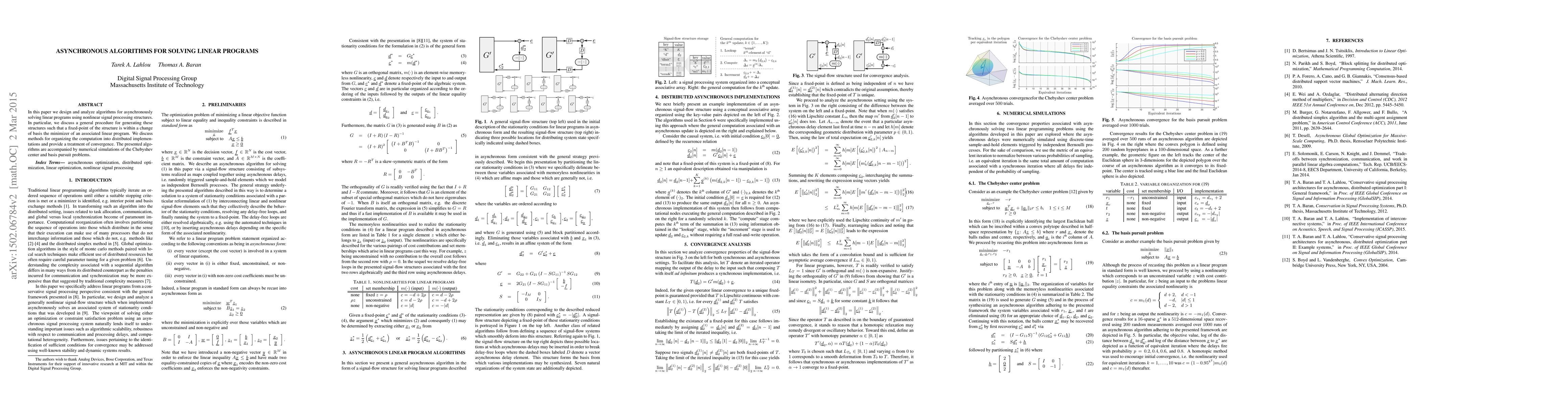 This paper develops asynchronous algorithms for solving linear programs using nonlinear signal processing structures, ensuring convergence to the minimizer through a fixed-point approach. It also explores distributed implementations and provides numerical simulations for specific problems like Chebyshev center and basis pursuit.