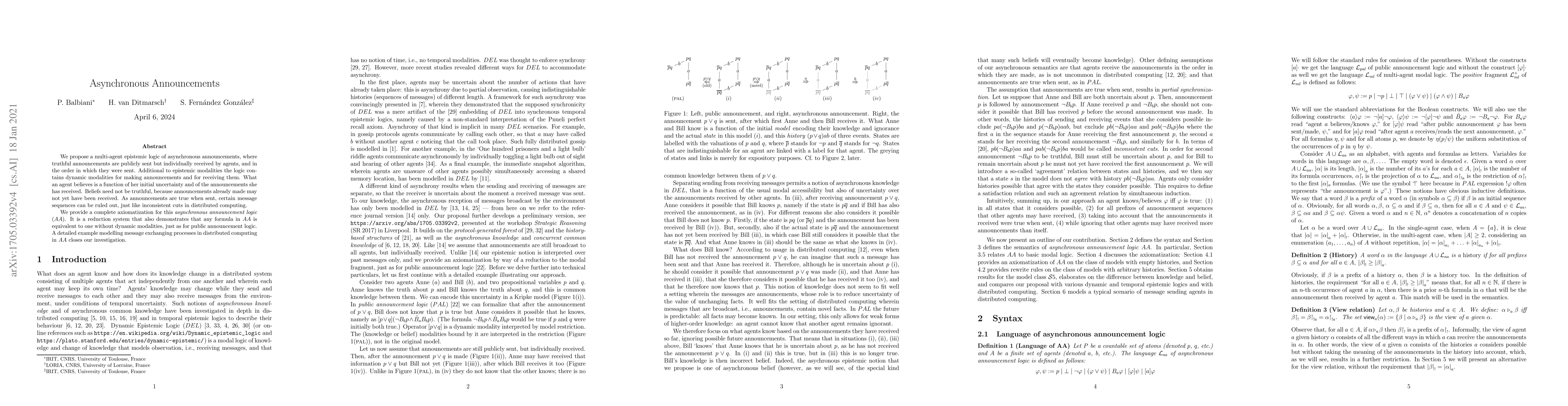 We propose a multi-agent epistemic logic of asynchronous announcements, where truthful announcements are publicly sent but individually received by agents, and in the order in which they were sent. Additional to epistemic modalities the logic contains dynamic modalities for making announcements and for receiving them. What an agent believes is a function of her initial uncertainty and of the announcements she has received. Beliefs need not be truthful, because announcements already made may not yet have been received. As announcements are true when sent, certain message sequences can be ruled out, just like inconsistent cuts in distributed computing. We provide a complete axiomatization for this \emph{asynchronous announcement logic} (AA). It is a reduction system that also demonstrates that any formula in $AA$ is equivalent to one without dynamic modalities, just as for public announcement logic. A detailed example modelling message exchanging processes in distributed computing in $AA$ closes our investigation.