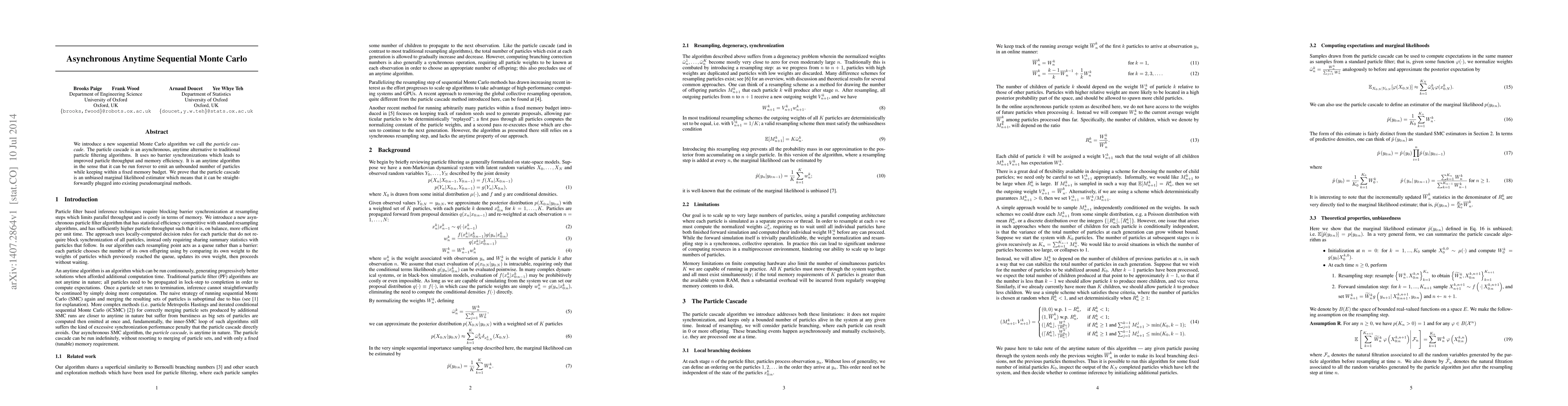 Summary: The paper introduces the particle cascade, an asynchronous, anytime sequential Monte Carlo algorithm that enhances particle throughput and memory efficiency without barrier synchronizations. It is an unbiased marginal likelihood estimator, allowing it to be seamlessly integrated into existing pseudomarginal methods.