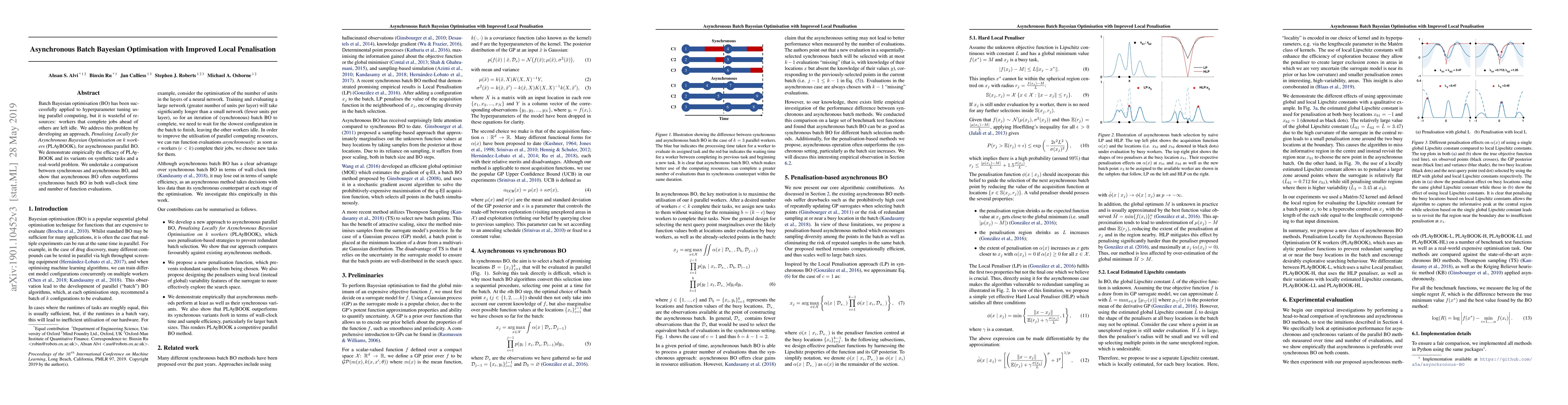 This paper introduces PLAyBOOK, a novel asynchronous batch Bayesian optimisation method for parallel computing that reduces resource waste by keeping workers active. Empirical results show that asynchronous BO outperforms synchronous BO in both time efficiency and function evaluations.