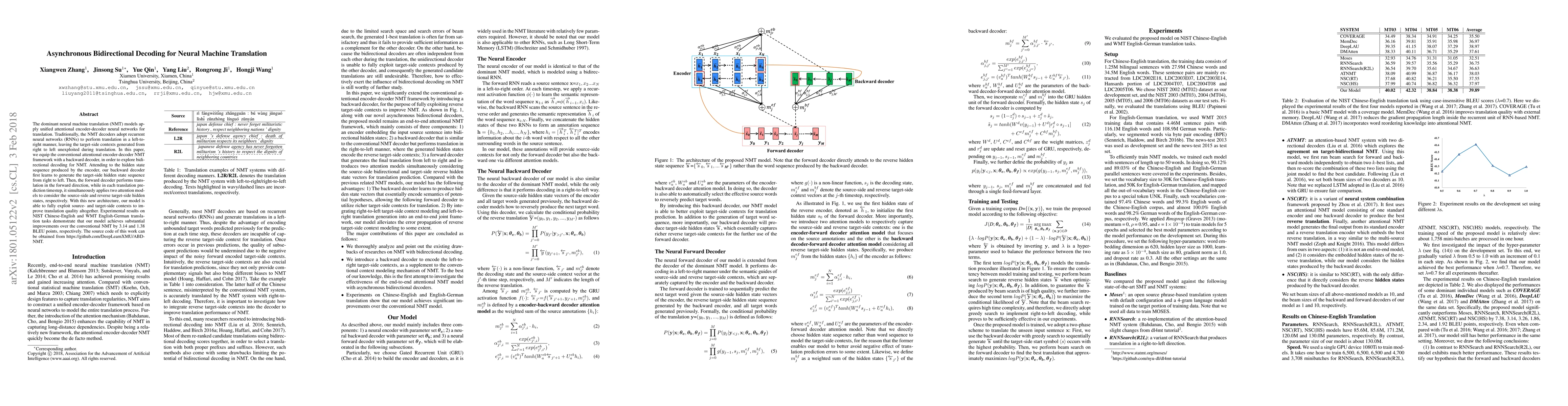 This paper introduces an asynchronous bidirectional decoding method for neural machine translation, enhancing the conventional encoder-decoder model by incorporating a backward decoder to utilize target-side contexts generated from right to left. Experimental results show significant improvements in translation quality, achieving 3.14 and 1.38 BLEU point gains on Chinese-English and English-German datasets, respectively.
