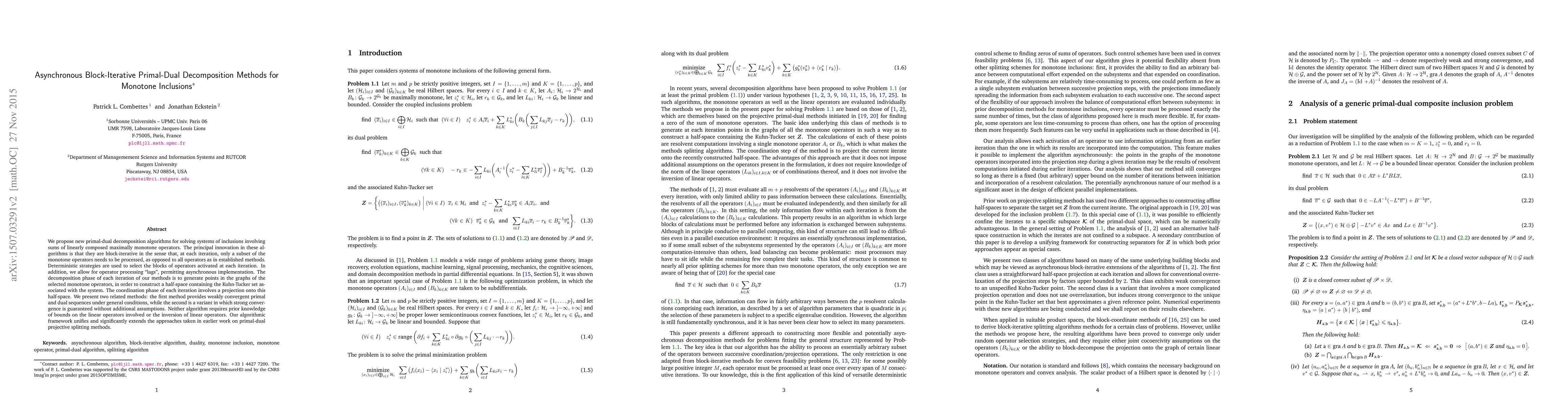 This paper introduces new asynchronous block-iterative primal-dual decomposition algorithms for solving monotone inclusions, allowing subsets of operators to be processed at each iteration and permitting asynchronous implementation. The methods achieve weak or strong convergence under general conditions without requiring bounds on operators or their inversion.