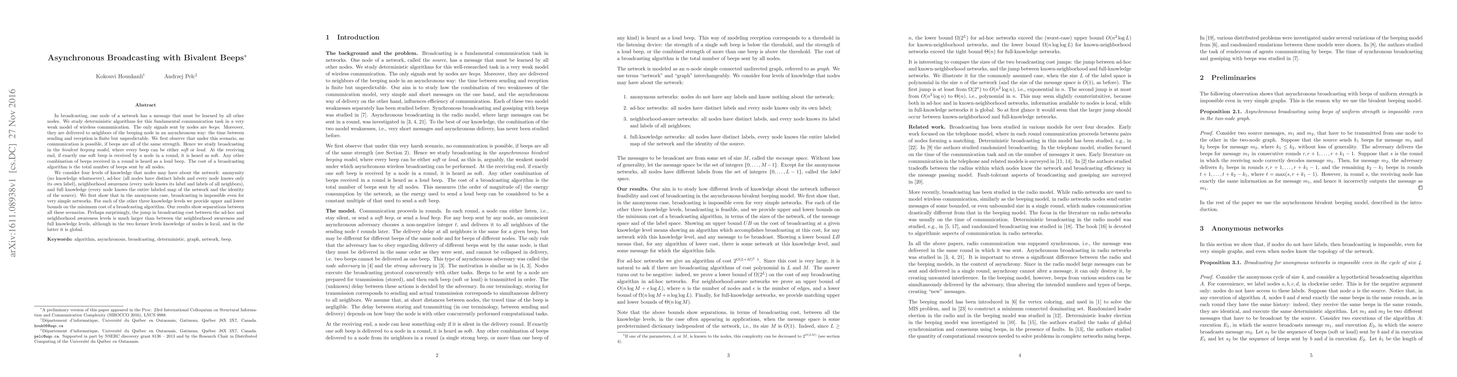 This paper explores deterministic algorithms for broadcasting a message in a network where nodes communicate via asynchronous bivalent beeps, which can be either soft or loud. It demonstrates that broadcasting is impossible in anonymous networks but provides upper and lower bounds for broadcasting costs under varying levels of node knowledge, revealing significant cost differences between ad-hoc and neighborhood awareness scenarios.