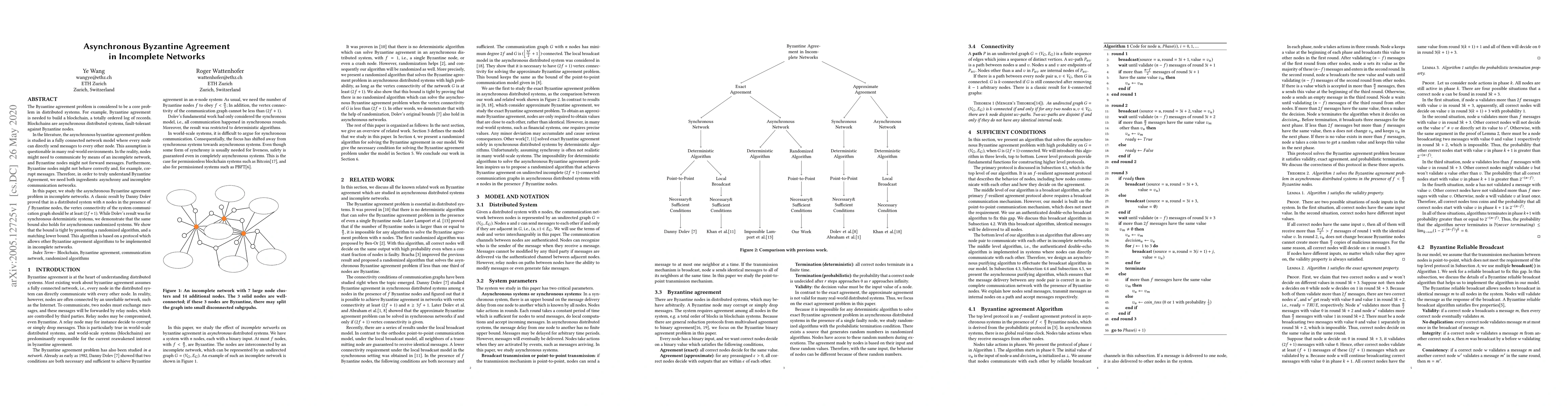 The Byzantine agreement problem is considered to be a core problem in distributed systems. For example, Byzantine agreement is needed to build a blockchain, a totally ordered log of records. Blockchains are asynchronous distributed systems, fault-tolerant against Byzantine nodes. In the literature, the asynchronous byzantine agreement problem is studied in a fully connected network model where every node can directly send messages to every other node. This assumption is questionable in many real-world environments. In the reality, nodes might need to communicate by means of an incomplete network, and Byzantine nodes might not forward messages. Furthermore, Byzantine nodes might not behave correctly and, for example, corrupt messages. Therefore, in order to truly understand Byzantine Agreement, we need both ingredients: asynchrony and incomplete communication networks. In this paper, we study the asynchronous Byzantine agreement problem in incomplete networks. A classic result by Danny Dolev proved that in a distributed system with n nodes in the presence of f Byzantine nodes, the vertex connectivity of the system communication graph should be at least (2f+1). While Dolev's result was for synchronous deterministic systems, we demonstrate that the same bound also holds for asynchronous randomized systems. We show that the bound is tight by presenting a randomized algorithm, and a matching lower bound.