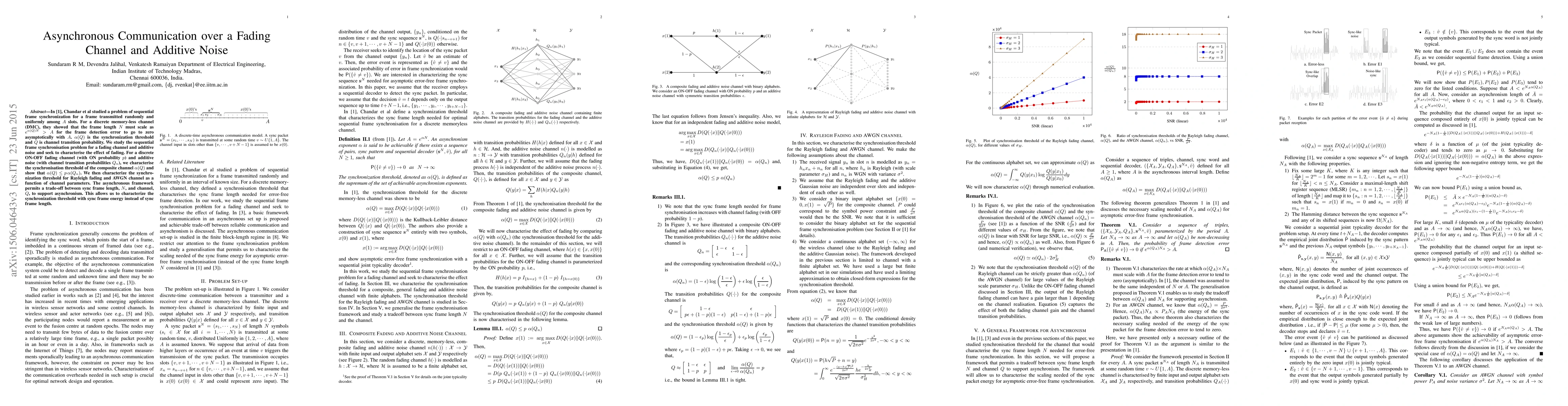 In \cite{Chandar2008}, Chandar et al studied a problem of sequential frame synchronization for a frame transmitted randomly and uniformly among $A$ slots. For a discrete memory-less channel (DMC), they showed that the frame length $N$ must scale as $e^{\alpha(Q)N}>A$ for the frame detection error to go to zero asymptotically with $A$. $\alpha(Q)$ is the synchronization threshold and $Q$ is channel transition probability. We study the sequential frame synchronisation problem for a fading channel and additive noise and seek to characterise the effect of fading. For a discrete ON-OFF fading channel (with ON probability $p$) and additive noise (with channel transition probabilities $Q_n$), we characterise the synchronisation threshold of the composite channel $\alpha(Q)$ and show that $\alpha(Q)\leq p\,\alpha(Q_n)$. We then characterize the synchronization threshold for Rayleigh fading and AWGN channel as a function of channel parameters. The asynchronous framework permits a trade-off between sync frame length, $N$, and channel, $Q$, to support asynchronism. This allows us to characterize the synchronization threshold with sync frame energy instead of sync frame length.