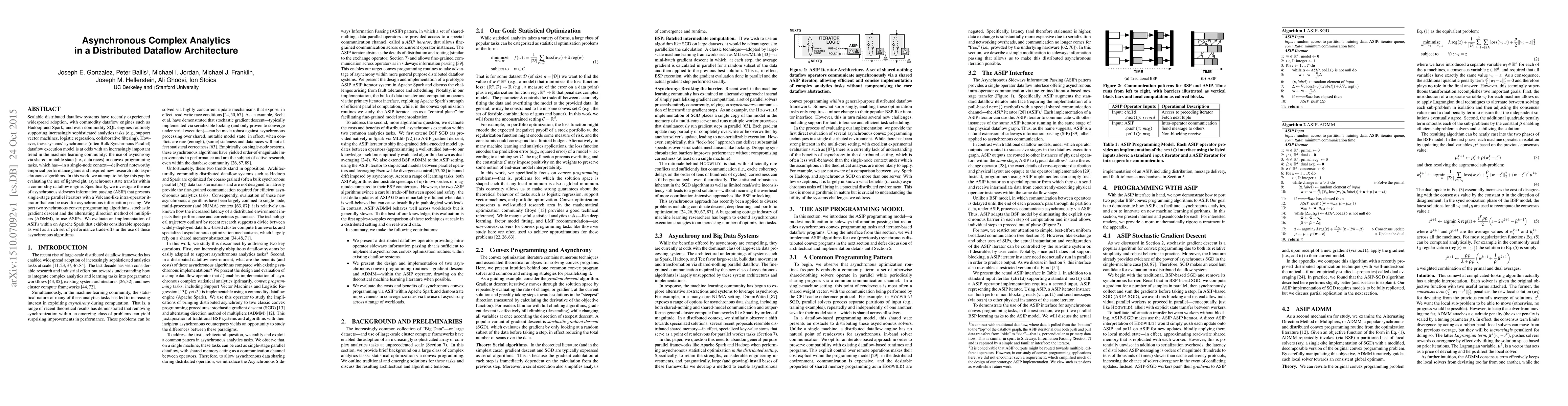 Scalable distributed dataflow systems have recently experienced widespread adoption, with commodity dataflow engines such as Hadoop and Spark, and even commodity SQL engines routinely supporting increasingly sophisticated analytics tasks (e.g., support vector machines, logistic regression, collaborative filtering). However, these systems' synchronous (often Bulk Synchronous Parallel) dataflow execution model is at odds with an increasingly important trend in the machine learning community: the use of asynchrony via shared, mutable state (i.e., data races) in convex programming tasks, which has---in a single-node context---delivered noteworthy empirical performance gains and inspired new research into asynchronous algorithms. In this work, we attempt to bridge this gap by evaluating the use of lightweight, asynchronous state transfer within a commodity dataflow engine. Specifically, we investigate the use of asynchronous sideways information passing (ASIP) that presents single-stage parallel iterators with a Volcano-like intra-operator iterator that can be used for asynchronous information passing. We port two synchronous convex programming algorithms, stochastic gradient descent and the alternating direction method of multipliers (ADMM), to use ASIPs. We evaluate an implementation of ASIPs within on Apache Spark that exhibits considerable speedups as well as a rich set of performance trade-offs in the use of these asynchronous algorithms.