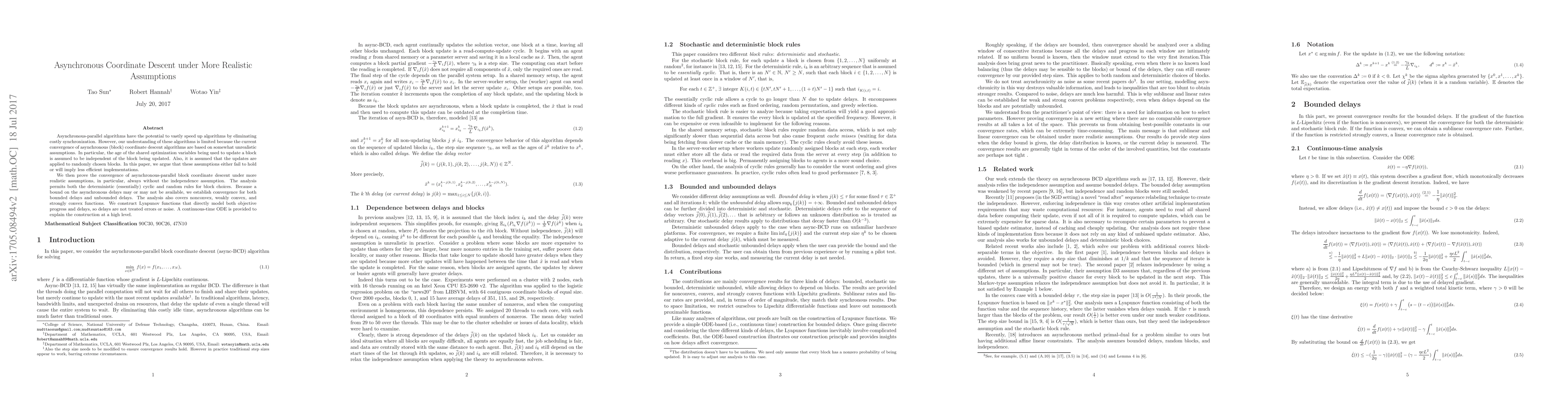 This paper addresses the convergence of asynchronous-parallel block coordinate descent under more realistic assumptions, moving beyond the independence of update ages and random block selection. It provides convergence proofs for both bounded and unbounded delays, applicable to nonconvex, weakly convex, and strongly convex functions, using constructed Lyapunov functions.