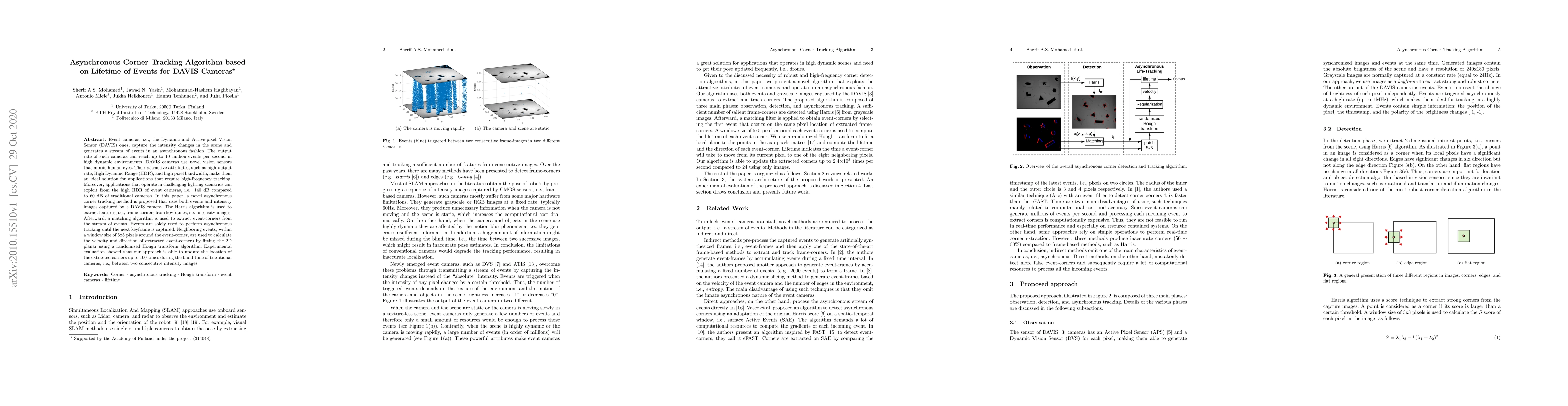 This paper proposes an asynchronous corner tracking algorithm for DAVIS event cameras that combines Harris algorithm-based feature extraction from intensity images with event-based tracking. The method updates corner locations up to 100 times between traditional camera frames, leveraging the high dynamic range and high output rate of event cameras.