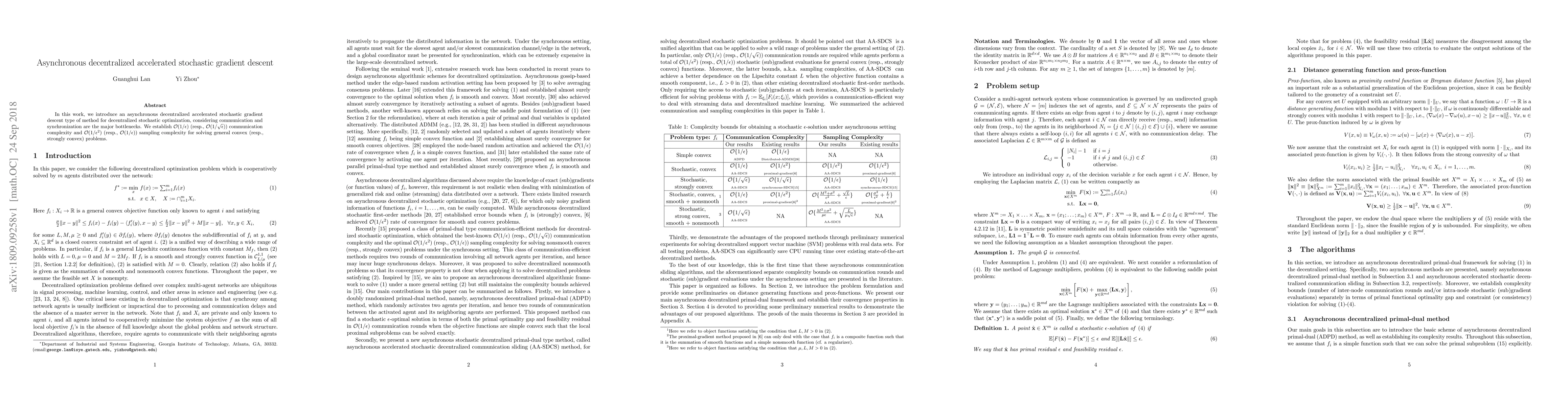 This paper proposes an asynchronous decentralized accelerated stochastic gradient descent method for decentralized optimization, addressing communication and synchronization challenges. The method achieves $\mathcal{O}(1/\epsilon)$ communication complexity and $\mathcal{O}(1/\epsilon^2)$ sampling complexity for general convex problems, and $\mathcal{O}(1/\sqrt{\epsilon})$ communication and $\mathcal{O}(1/\epsilon)$ sampling complexity for strongly convex problems.