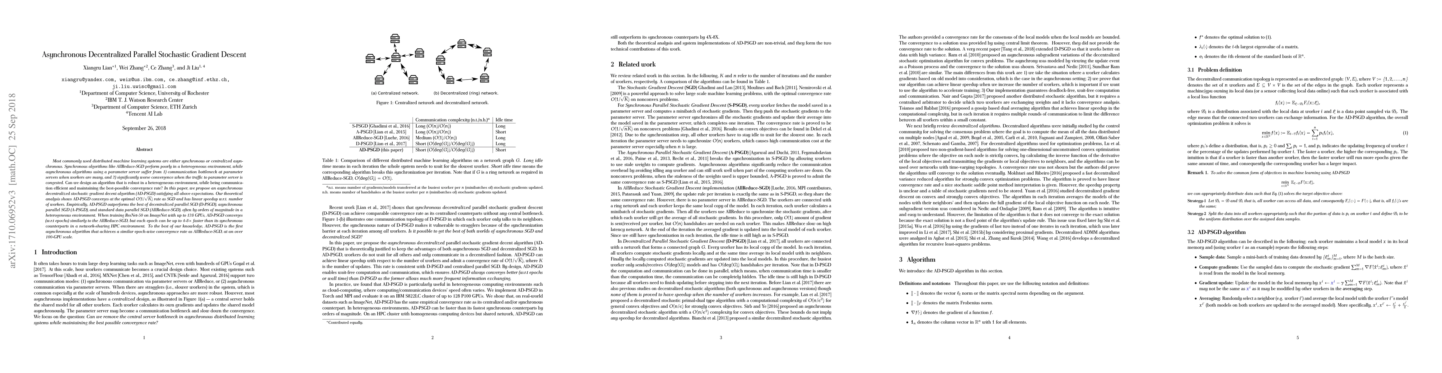 This paper proposes an asynchronous decentralized parallel stochastic gradient descent algorithm (AD-PSGD) that achieves optimal convergence rates and linear speedup with respect to the number of workers, outperforming synchronous and other asynchronous methods in heterogeneous environments. AD-PSGD demonstrates significant speed improvements while maintaining similar convergence rates to synchronous methods.