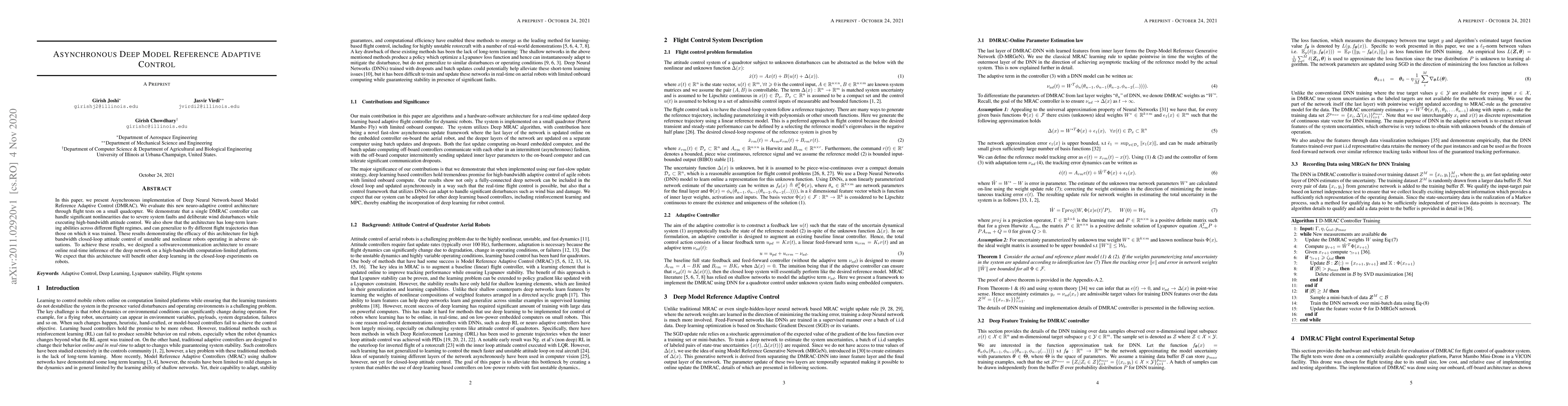 In this paper, we present Asynchronous implementation of Deep Neural Network-based Model Reference Adaptive Control (DMRAC). We evaluate this new neuro-adaptive control architecture through flight tests on a small quadcopter. We demonstrate that a single DMRAC controller can handle significant nonlinearities due to severe system faults and deliberate wind disturbances while executing high-bandwidth attitude control. We also show that the architecture has long-term learning abilities across different flight regimes, and can generalize to fly different flight trajectories than those on which it was trained. These results demonstrating the efficacy of this architecture for high bandwidth closed-loop attitude control of unstable and nonlinear robots operating in adverse situations. To achieve these results, we designed a software+communication architecture to ensure online real-time inference of the deep network on a high-bandwidth computation-limited platform. We expect that this architecture will benefit other deep learning in the closed-loop experiments on robots.