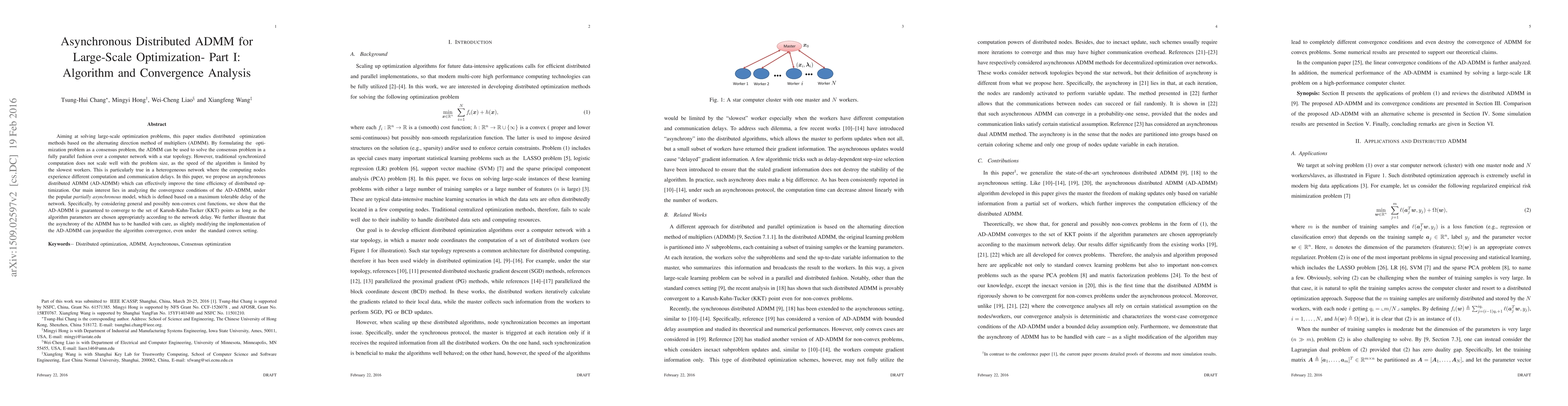This paper proposes an asynchronous distributed ADMM (AD-ADMM) to enhance the time efficiency of large-scale optimization problems over a network. It analyzes the convergence conditions under a partially asynchronous model, showing that AD-ADMM converges to KKT points with appropriate parameter selection, while caution is needed to avoid convergence issues even in convex settings.