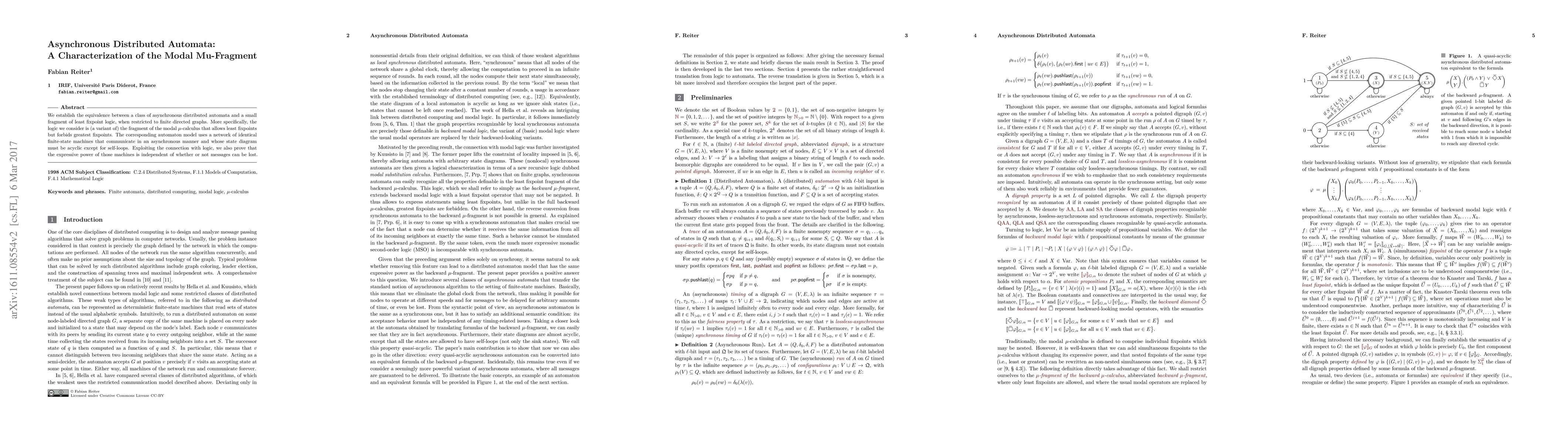 We establish the equivalence between a class of asynchronous distributed automata and a small fragment of least fixpoint logic, when restricted to finite directed graphs. More specifically, the logic we consider is (a variant of) the fragment of the modal $\mu$-calculus that allows least fixpoints but forbids greatest fixpoints. The corresponding automaton model uses a network of identical finite-state machines that communicate in an asynchronous manner and whose state diagram must be acyclic except for self-loops. Exploiting the connection with logic, we also prove that the expressive power of those machines is independent of whether or not messages can be lost.