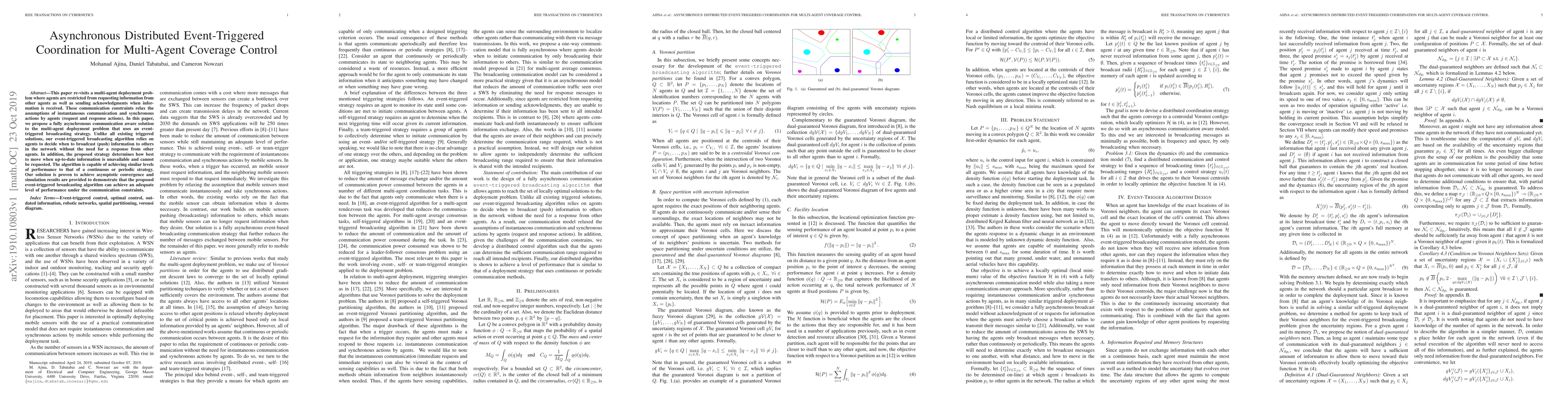 This paper proposes an asynchronous, event-triggered broadcasting strategy for multi-agent coverage control under communication constraints, achieving performance comparable to continuous strategies while ensuring asymptotic convergence. Simulation results validate the effectiveness of the proposed algorithm.