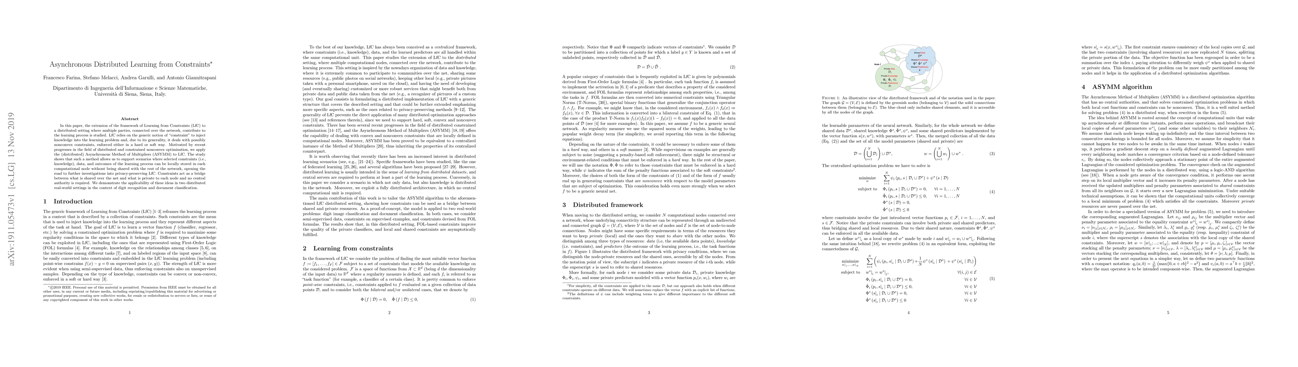 In this paper, the extension of the framework of Learning from Constraints (LfC) to a distributed setting where multiple parties, connected over the network, contribute to the learning process is studied. LfC relies on the generic notion of "constraint" to inject knowledge into the learning problem and, due to its generality, it deals with possibly nonconvex constraints, enforced either in a hard or soft way. Motivated by recent progresses in the field of distributed and constrained nonconvex optimization, we apply the (distributed) Asynchronous Method of Multipliers (ASYMM) to LfC. The study shows that such a method allows us to support scenarios where selected constraints (i.e., knowledge), data, and outcomes of the learning process can be locally stored in each computational node without being shared with the rest of the network, opening the road to further investigations into privacy-preserving LfC. Constraints act as a bridge between what is shared over the net and what is private to each node and no central authority is required. We demonstrate the applicability of these ideas in two distributed real-world settings in the context of digit recognition and document classification.