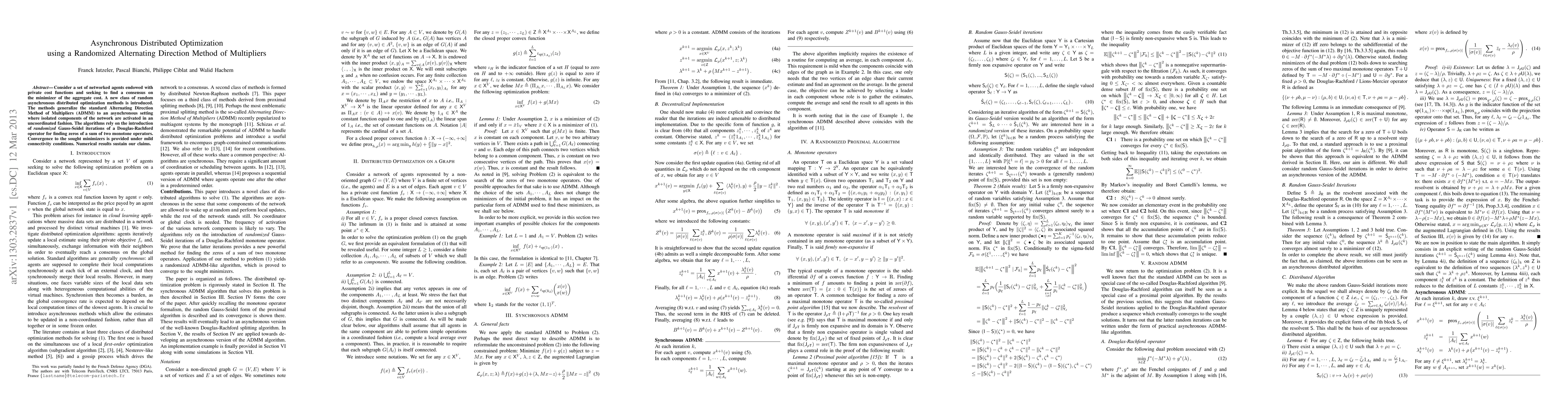 This paper introduces asynchronous distributed optimization methods that generalize the Alternating Direction Method of Multipliers (ADMM) for networked agents. The proposed algorithms use randomized Gauss-Seidel iterations to achieve convergence under mild connectivity conditions, supported by numerical results.