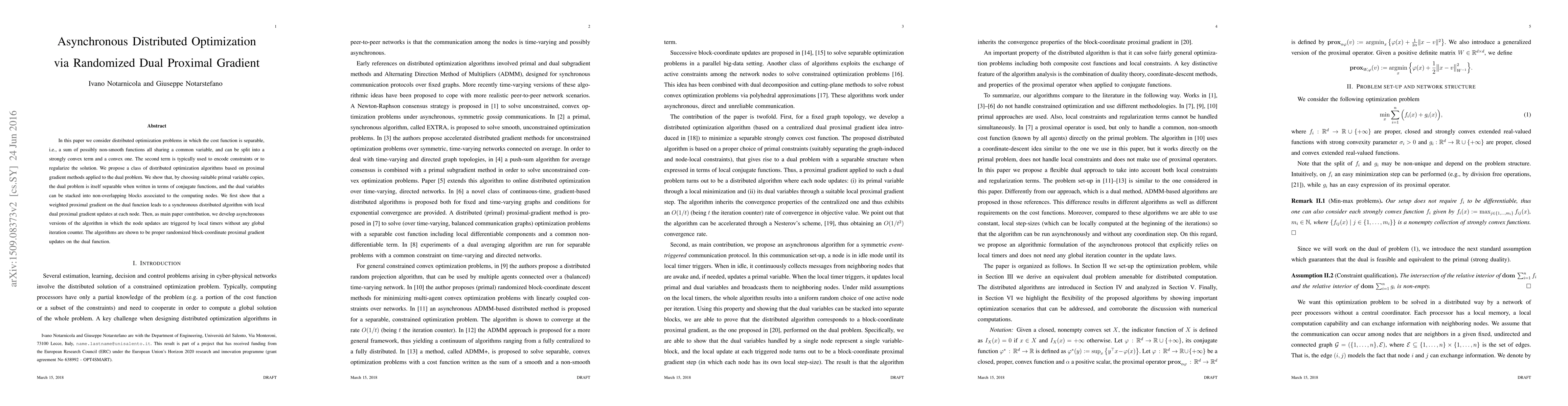 This paper proposes distributed optimization algorithms for separable cost functions using randomized dual proximal gradient methods. It introduces asynchronous versions of the algorithm that allow local updates without a global iteration counter, demonstrating proper randomized block-coordinate proximal gradient updates on the dual function.