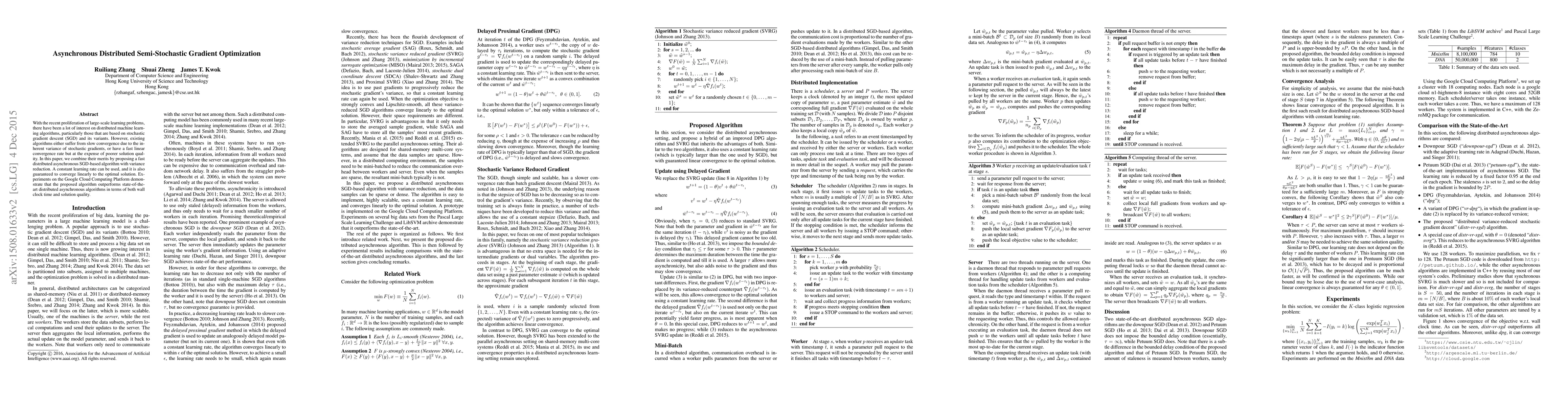 With the recent proliferation of large-scale learning problems,there have been a lot of interest on distributed machine learning algorithms, particularly those that are based on stochastic gradient descent (SGD) and its variants. However, existing algorithms either suffer from slow convergence due to the inherent variance of stochastic gradients, or have a fast linear convergence rate but at the expense of poorer solution quality. In this paper, we combine their merits by proposing a fast distributed asynchronous SGD-based algorithm with variance reduction. A constant learning rate can be used, and it is also guaranteed to converge linearly to the optimal solution. Experiments on the Google Cloud Computing Platform demonstrate that the proposed algorithm outperforms state-of-the-art distributed asynchronous algorithms in terms of both wall clock time and solution quality.