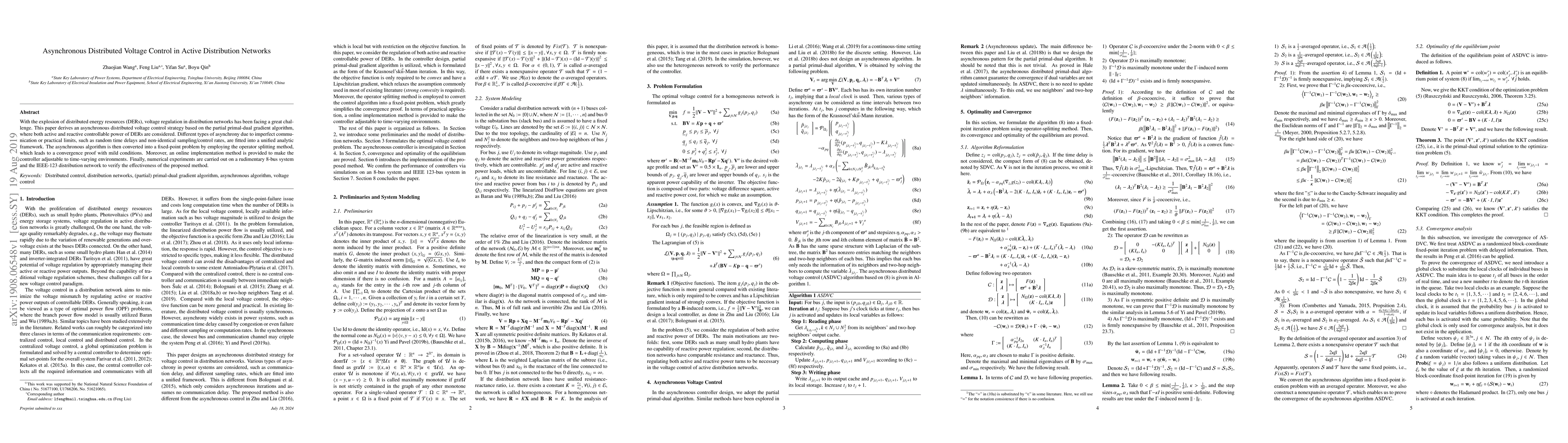 This paper proposes an asynchronous distributed voltage control strategy for active distribution networks using the partial primal-dual gradient algorithm, addressing various types of asynchrony. The method is proven to converge under mild conditions and is demonstrated through numerical experiments on an 8-bus system and the IEEE-123 network.