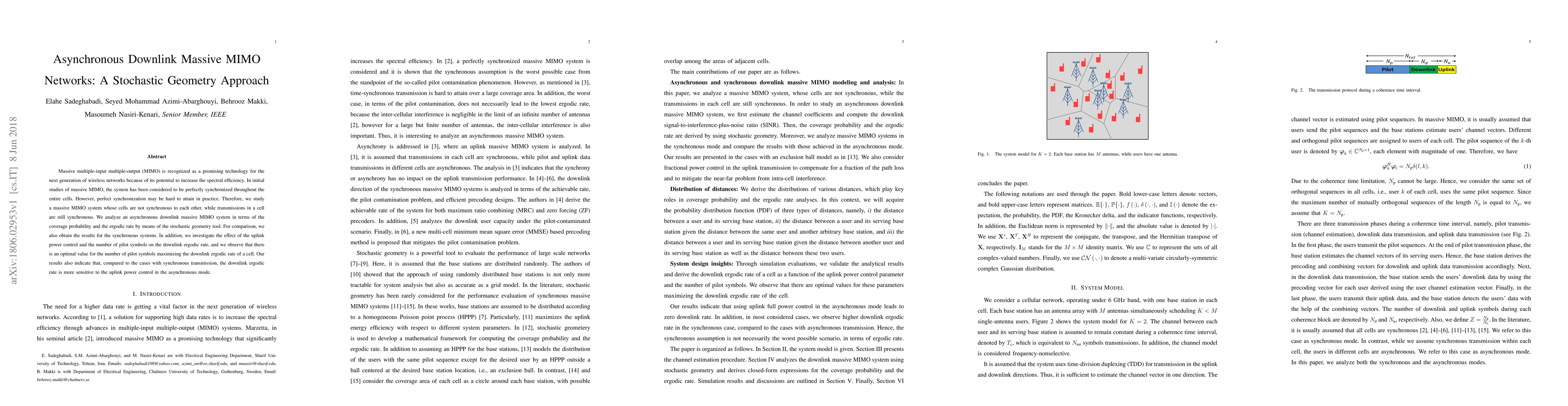 This paper examines an asynchronous downlink massive MIMO system using stochastic geometry, analyzing coverage probability and ergodic rate. It finds that the downlink performance is more sensitive to uplink power control compared to synchronous systems, and identifies an optimal number of pilot symbols for maximizing downlink ergodic rate.