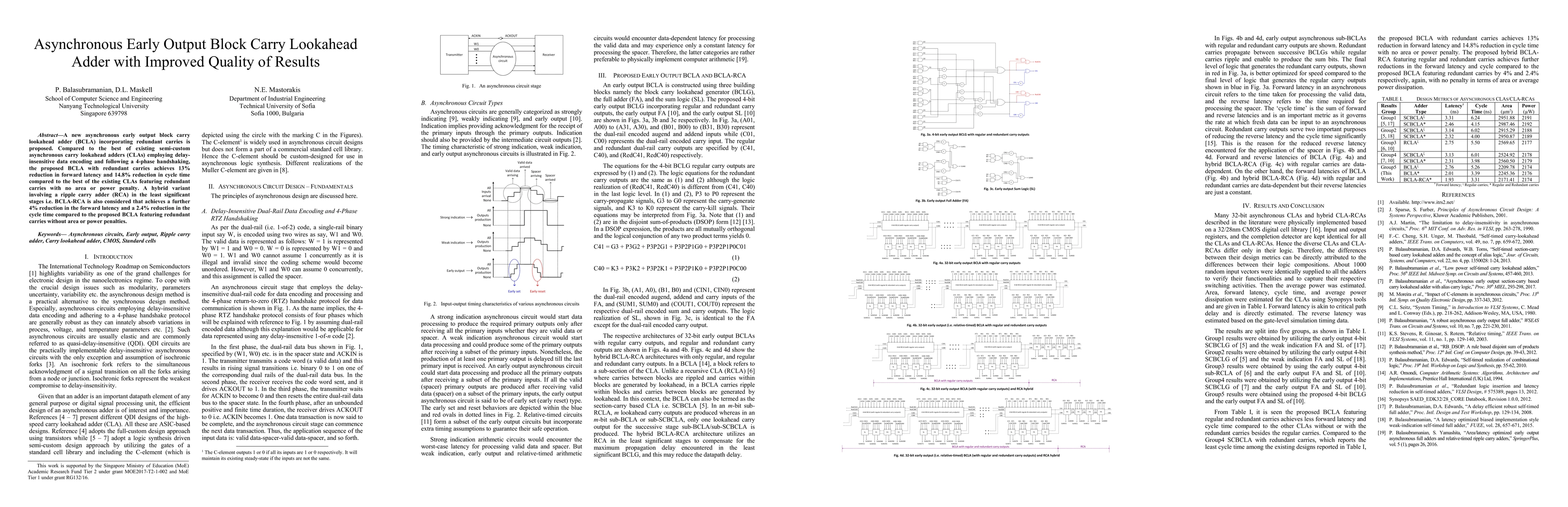 This paper proposes an asynchronous early output block carry lookahead adder with redundant carries, achieving a 13% reduction in forward latency and 14.8% reduction in cycle time compared to existing designs, with no area or power penalties. A hybrid variant combining with a ripple carry adder further reduces latency and cycle time by 4% and 2.4% respectively.