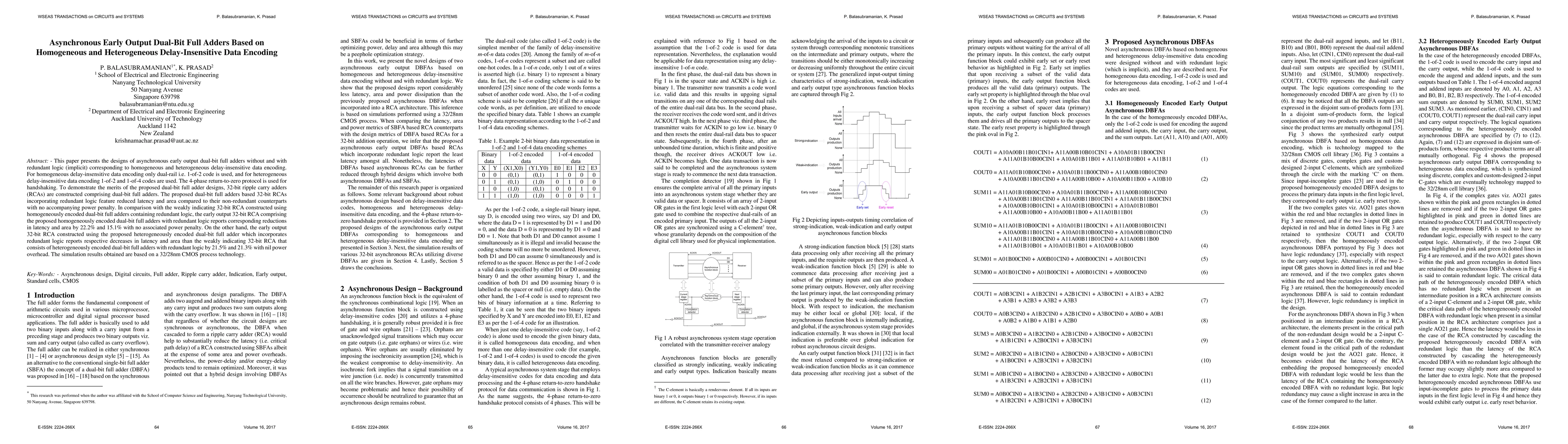 This paper designs asynchronous early output dual-bit full adders using homogeneous and heterogeneous delay-insensitive data encoding, showing reduced latency and area with no power penalty compared to traditional designs. The proposed designs improve 32-bit ripple carry adders by up to 22.2% in latency and 21.3% in area reduction.